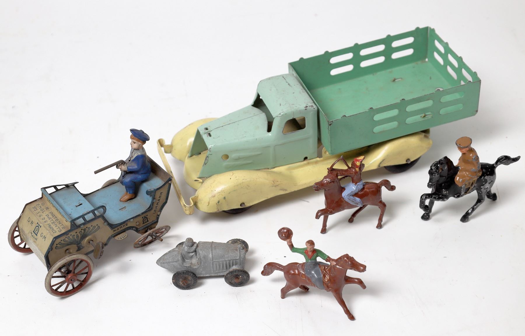 Vintage metal toys. Cast iron-2 horses with riders, cargo truck(grill mising), wind up carriage, race car, soldier on horse. 3x3.5" to 3x10.5".