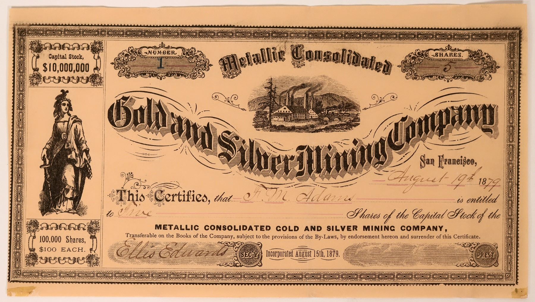 Incorp. August 1879 Calif. #1, I/U, 5 shares @ $100 ea issued F.M Adams August 1879, signed Ellis Edwards secretary. Black, no seal, vignette left Lady Justice, top foundry river background. EF. According to Sacramento Daily Union, Volume 8, Number 135, 15 August 1879, this company was formed to mine in the Bodie Mining District, Mono County, California.