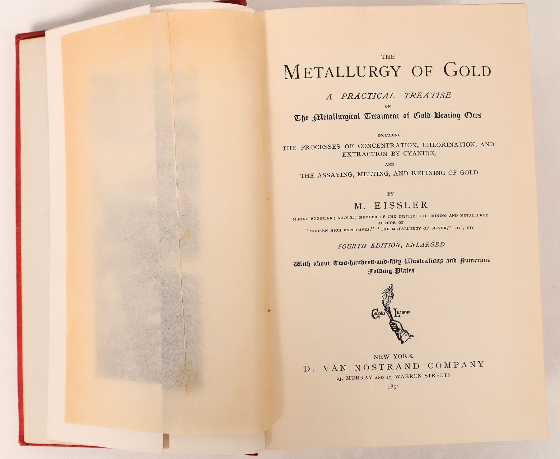 The Metallurgy of Gold: 1896 By Manuel Eissler. London Crosby Lockwood & Son Hardcover. A practical treatise on the Metallurgical Treatment of Gold Bearing Ores including concentration, chlorination, extraction, assaying, refining etc. Fourth ed. revised. With 250 illustrations and numerous folding plates 678pp and 8pp adverts. Newly rebound maroon cloth. gilt. P-275