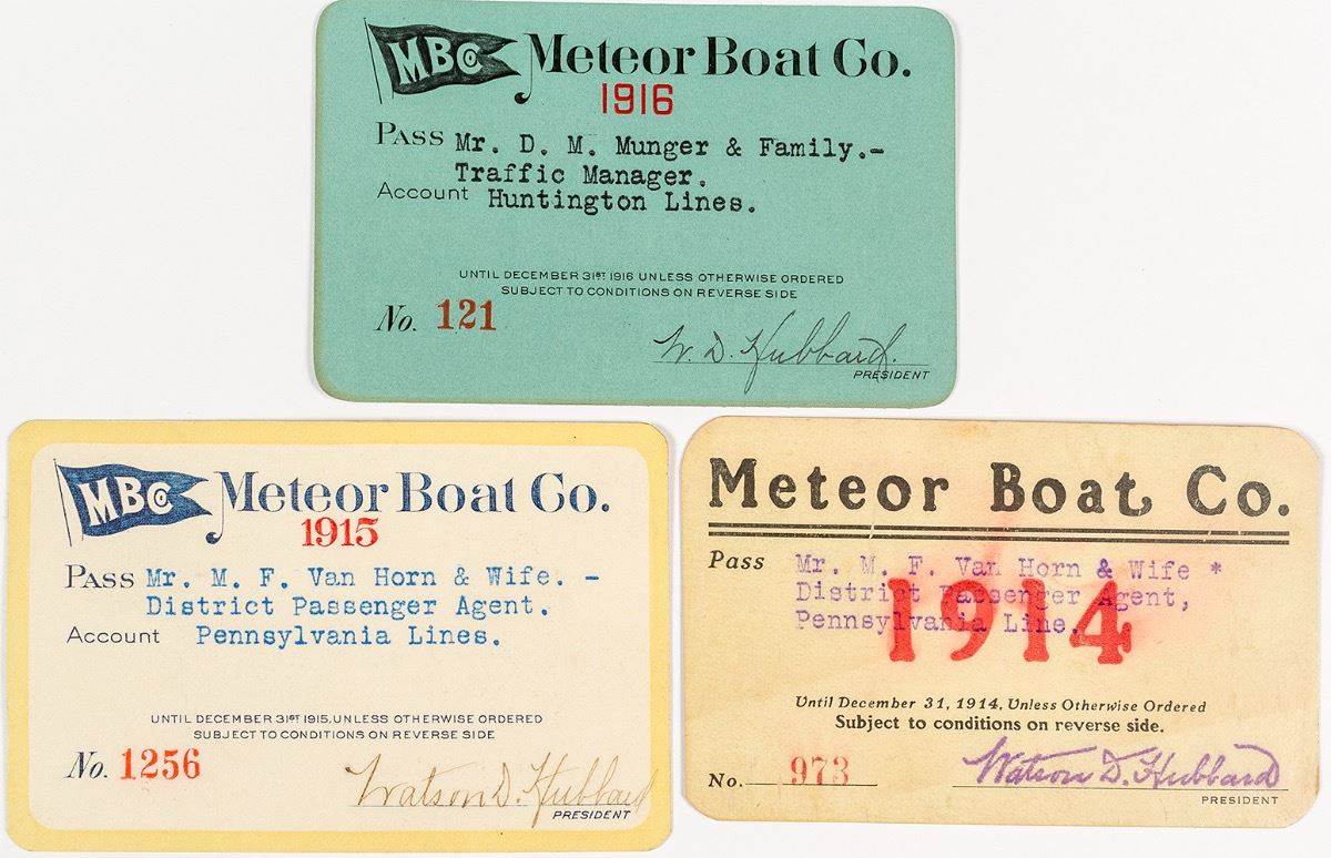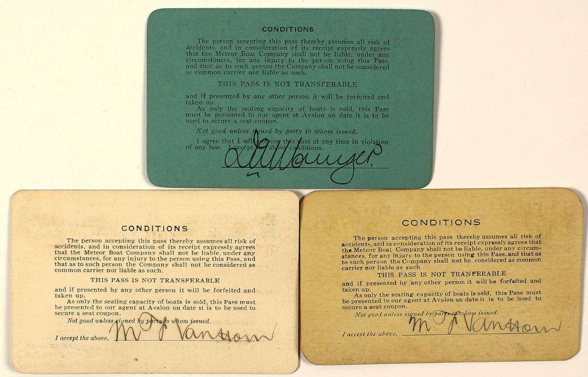 Three different. Includes: 1914, 1915, and 1916. All printed on cardstock and signed by Hubbard, the company president. The 1914 pass has the most wear; the other two, minor. (Prag Collection) City: Santa Catalina Island State: California, Date: Inventory# 39207