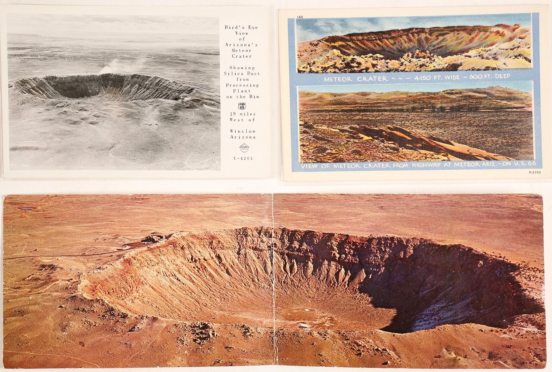 Lot of 3 postcards of Arizona's meteor crater. One of the post cards is folded and is actually a large picture. Date: Ca. 1940 Location: Meteor Crater, Arizona HWAC# 63569
