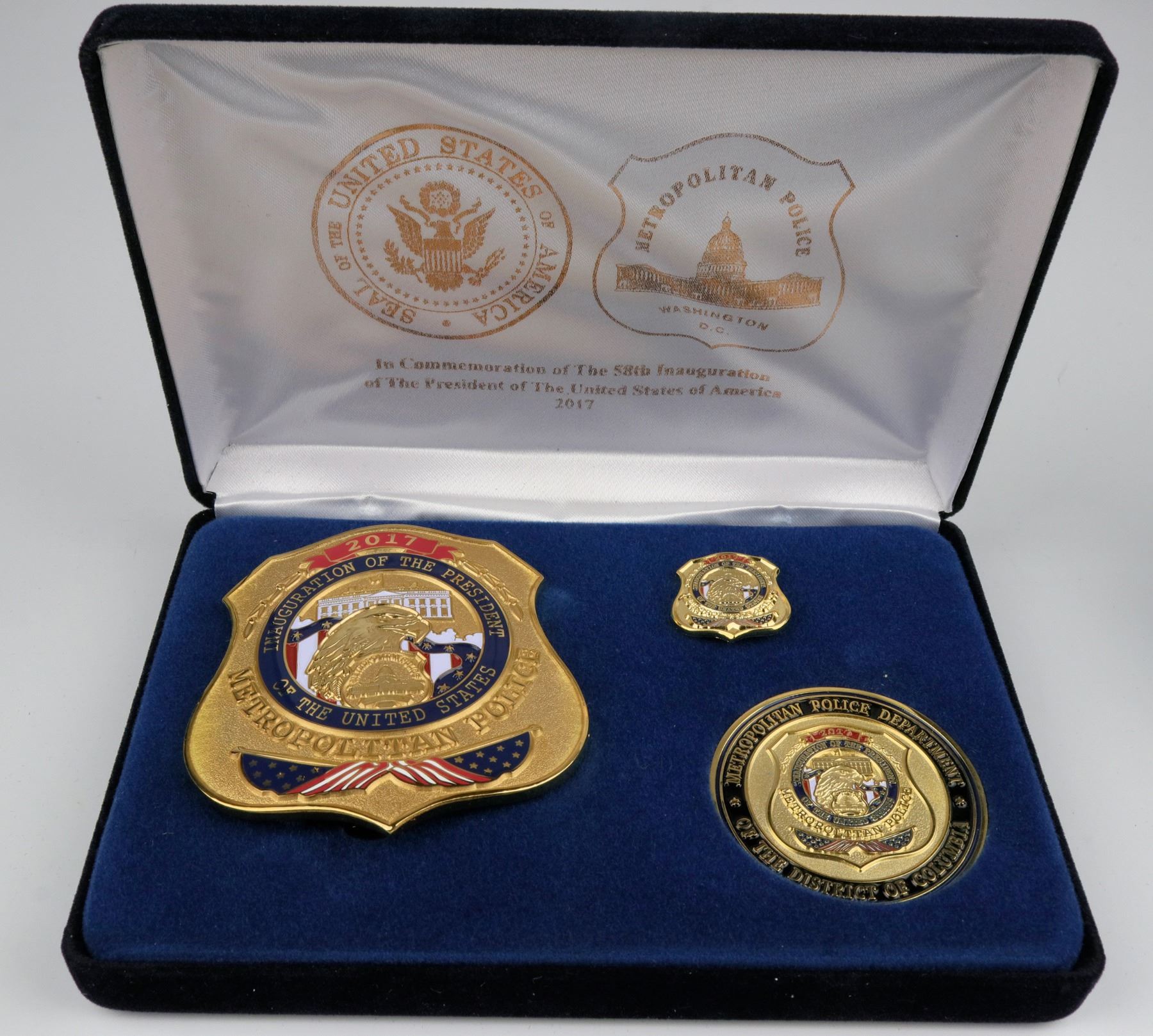 Made by Collinson, solid brass, pure gold plate. This is a complete presentation box w/Badge, lapel pin (mini badge) and Challenge coin, satin liner, gold foil on satin and outside of box. Initially issued only to Metro , invited Law Enforcement and Military personnel. Same as the metro badge shape and size. #6973 White House w/eagle foreground center, Stars and Stripes. 2017 top in red and gold. Pin and clasp, w/mirror back. Lapel pin is exactly as the full size. Challenge coin obv. has the badge in center w/ agency name in black circle. Rev. Capitol Bldg center, 2017 below, 58th inauguration above, Stars and Stripes on either side. Certificate by Collison included. Item is sold as a historical/collectible only. It does not convey, nor should it be used as an authority of any kind. Sale of this item is in full compliance with the United States Federal Law : 18 USC ss716. Impersonation of a police officer is a felony in most jurisdictions and subject to arrest.