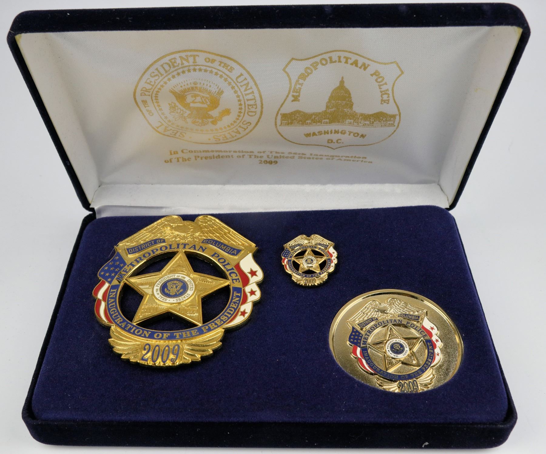 Collinson: .102” solid brass, pure gold plate, COA, Presentation box and case. #R0679, 2009 full size badge,, lapel pin (mini badge) and challenge coin. Great design, issued only for this event. Shield w/5 point star center.. Coin Has image of badge on obverse. Reverse is a rendition of 1917 Metro P.D. “Additional Private” badge. Complete presentation box and case w/gold embossing inside case and on box. NEW. Item is sold as a historical/collectible only. It does not convey, nor should it be used as an authority of any kind. Sale of this item is in full compliance with the United States Federal Law : 18 USC ss716. Impersonation of a police officer is a felony in most jurisdictions and subject to arrest.