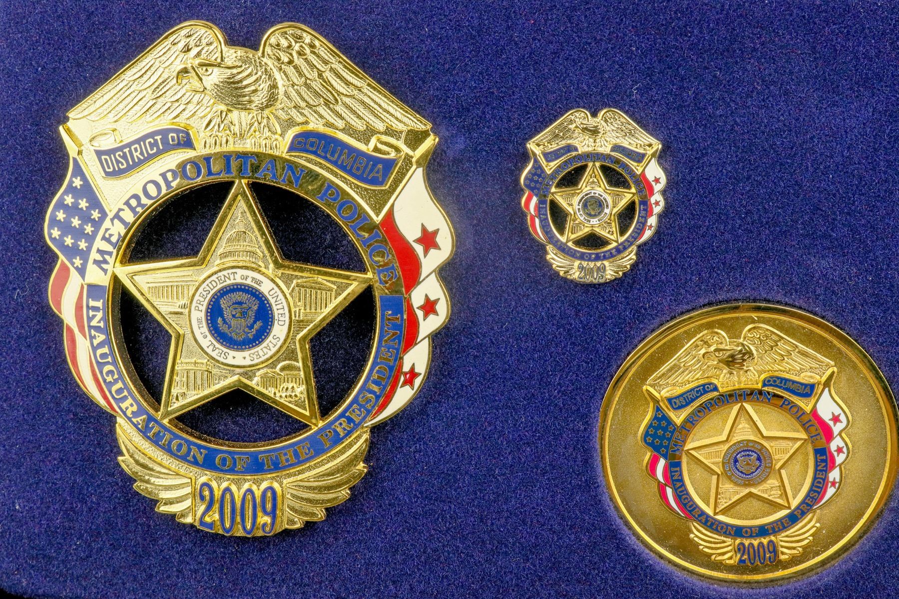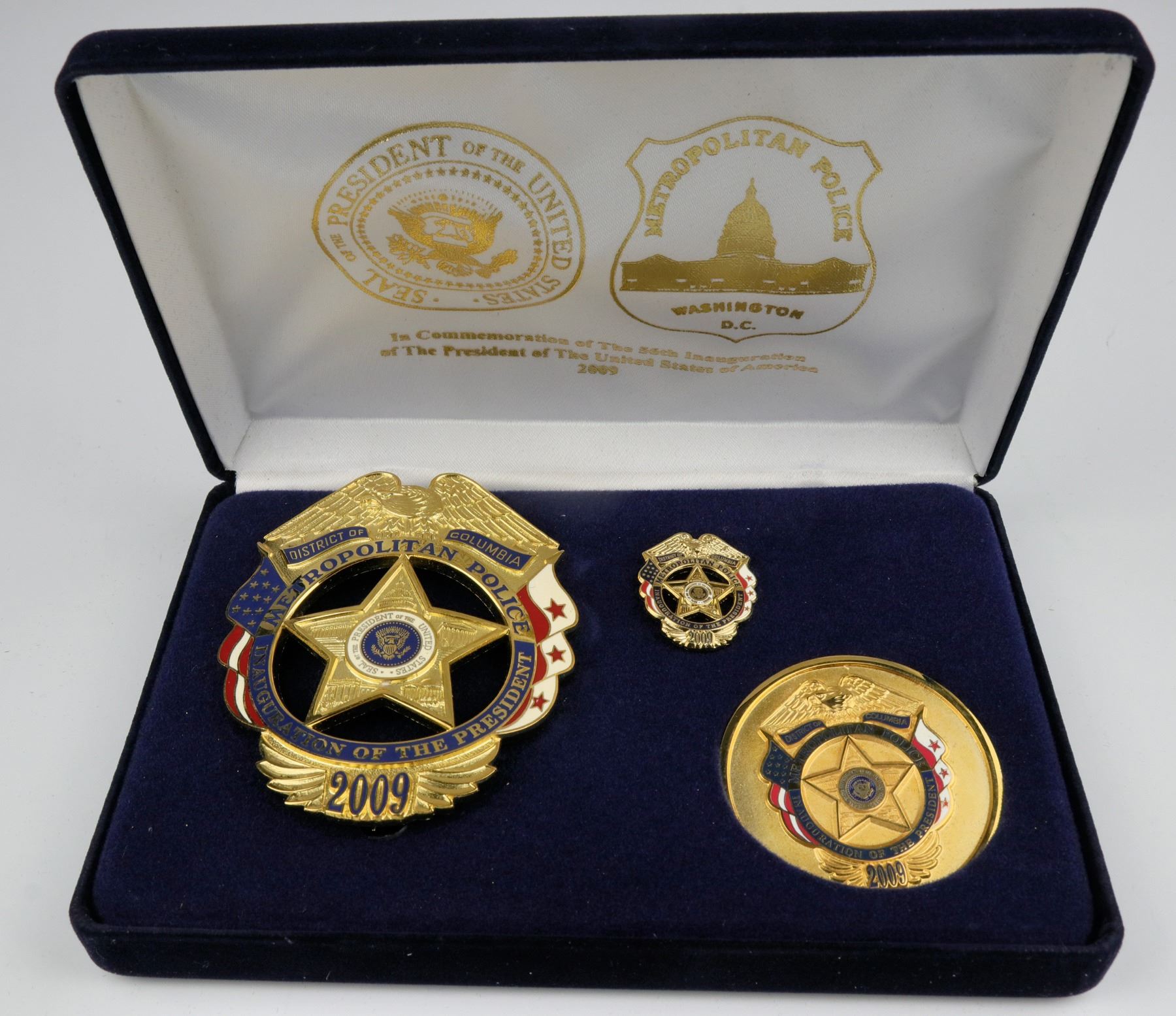 Collinson: .102” solid brass, pure gold plate, COA, Presentation box and case. #7561, 2009 full size badge,, lapel pin (mini badge) and challenge coin. Great design, issued only for this event. Shield w/5 point star center.. Coin Has image of badge on obverse. Reverse is a rendition of 1917 Metro P.D. “Additional Private” badge. Complete presentation box and case w/gold embossing inside case and on box. NEW. Item is sold as a historical/collectible only. It does not convey, nor should it be used as an authority of any kind. Sale of this item is in full compliance with the United States Federal Law : 18 USC ss716. Impersonation of a police officer is a felony in most jurisdictions and subject to arrest.