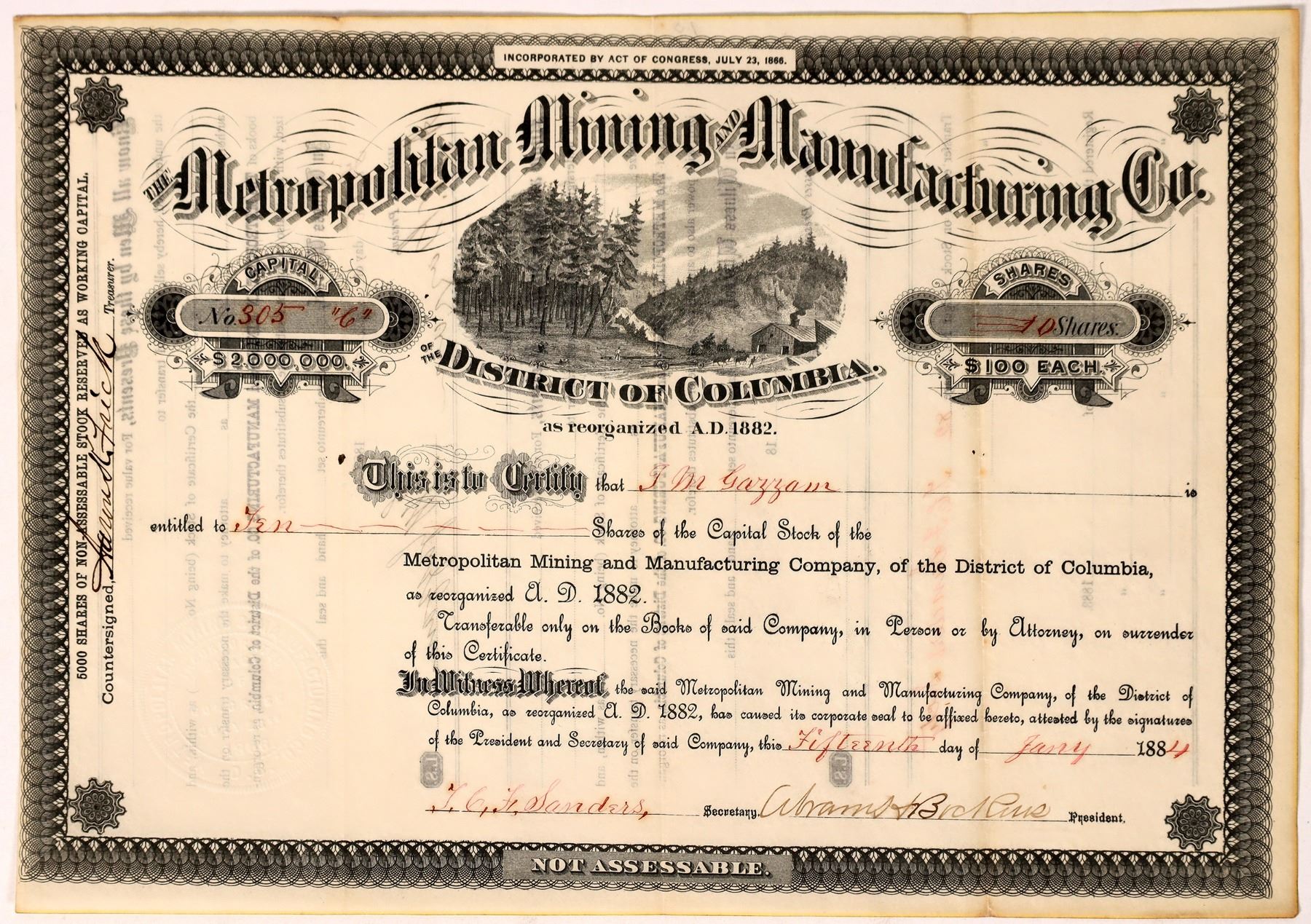 The Metropolitan Mining and Manufacturing Company of the District of Columbia, as reorganized A.D. 1882, stock certificate No. 305, "incorporated by act of Congress, July 23, 1866" printed in top border. Issued to J.M. Gazzam for 10 shares on January 15, 1884. Signed by L.G.F. Sanders (secretary) and Abrams + Brolpine(?) (president). Ornate black border, black print on creme. Vignette of mill house in hills next to forest with lumberjacks working. Very little can be found on this company, except that according to the U.S. Statutes at Large (volume 14, 1866), there was an Act of Congress to incorporate this mining company in 1866 - Senator Lyman Trumbull spoke during the proceedings. Mine was not located in Colorado. Washington, D.C. Herzog Collection