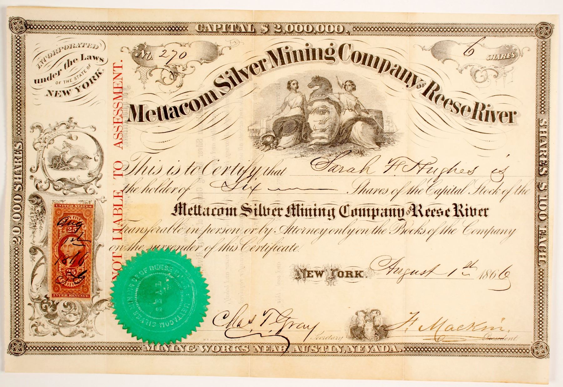 # 270 for 6 shares to Sarah Hughes. Datelined New York 1866. Signed by secretary Charles T Gray and H Mackin. 25c Certificate Revenue stamp. MR Dennis & Company of Newark printers. Green seal, allegorical vignettes. Folds, other light wear. 7.5 x 11" The Mettacom was located on Lander Hill next to the Florida Mine. It was a regularly producing mine from 1866-69. Blake's 1869 report says they produced 26 tons. The mill was not being used by the fall of 1869. Fuller & Lane refurbished the mill to use as a custom mill. All the outside ores from the small mines were going to the Manhattan Co.'s mill, and Fuller thought he could force the Manhattan to keep their prices down if he kept the Mettcom open. It worked. A British company, The Pacific Mining Co., bought the Mettacom and mill in Oct. 1869. They were eventually bought by the Manhattan Co. in 1876. Prag Collection City: Reese River State: Nevada Date: 1866 HWAC# 80400