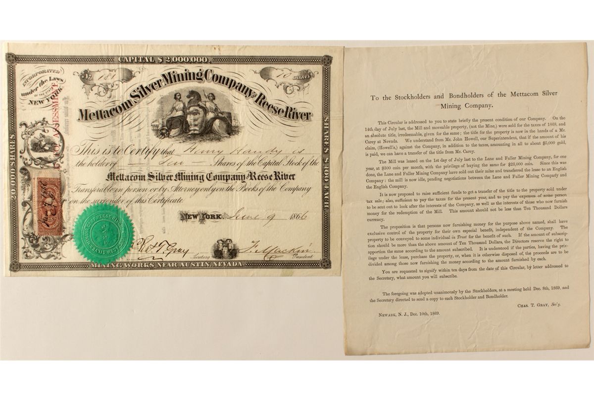 Lot of two. 1) Stock # 181 for 10 shares to Henry Handy in 1866 Signed by Charles Gray and F. Mackin. Large brown US 25c stamp. Stock is stamped "not liable to assessment." Red stamp is partially hidden. 2) 1869 letter from Gray to the stockholders and bondholders. It is a state of the company letter which says that the mine was sold for taxes in 1868!