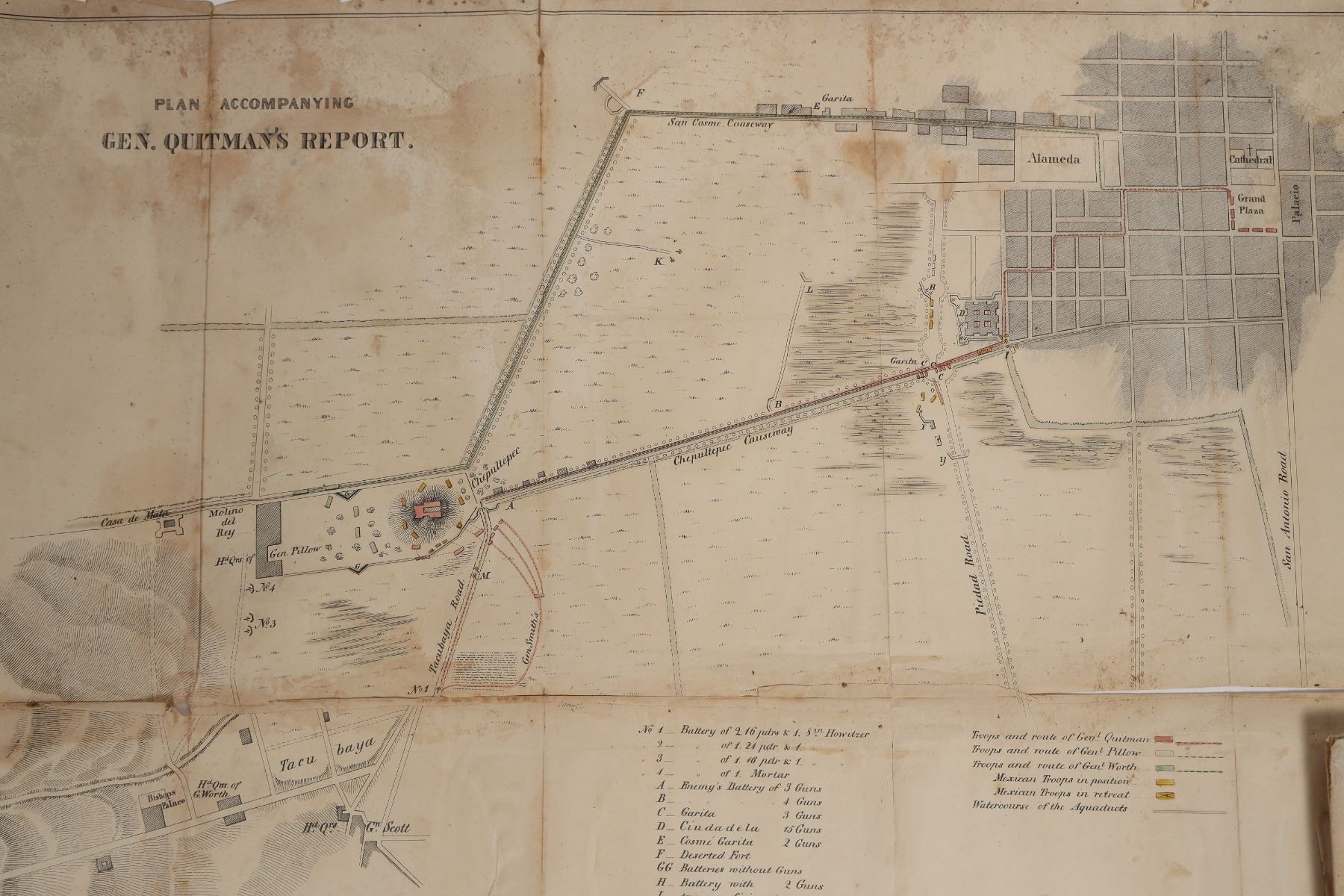 (1) A map depicting the attack on Mexico City by General Quitman and Wool, General Winfield Scott at 19.5 in. X 13 in. with foxed and folded corners two pieces together. A military map for Sept. 13-14, 1846.