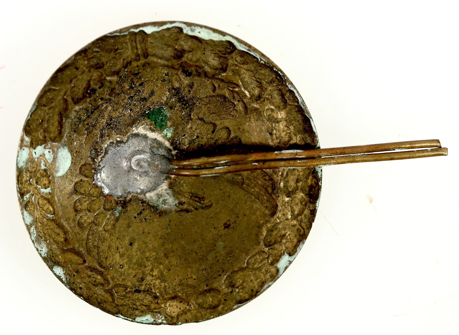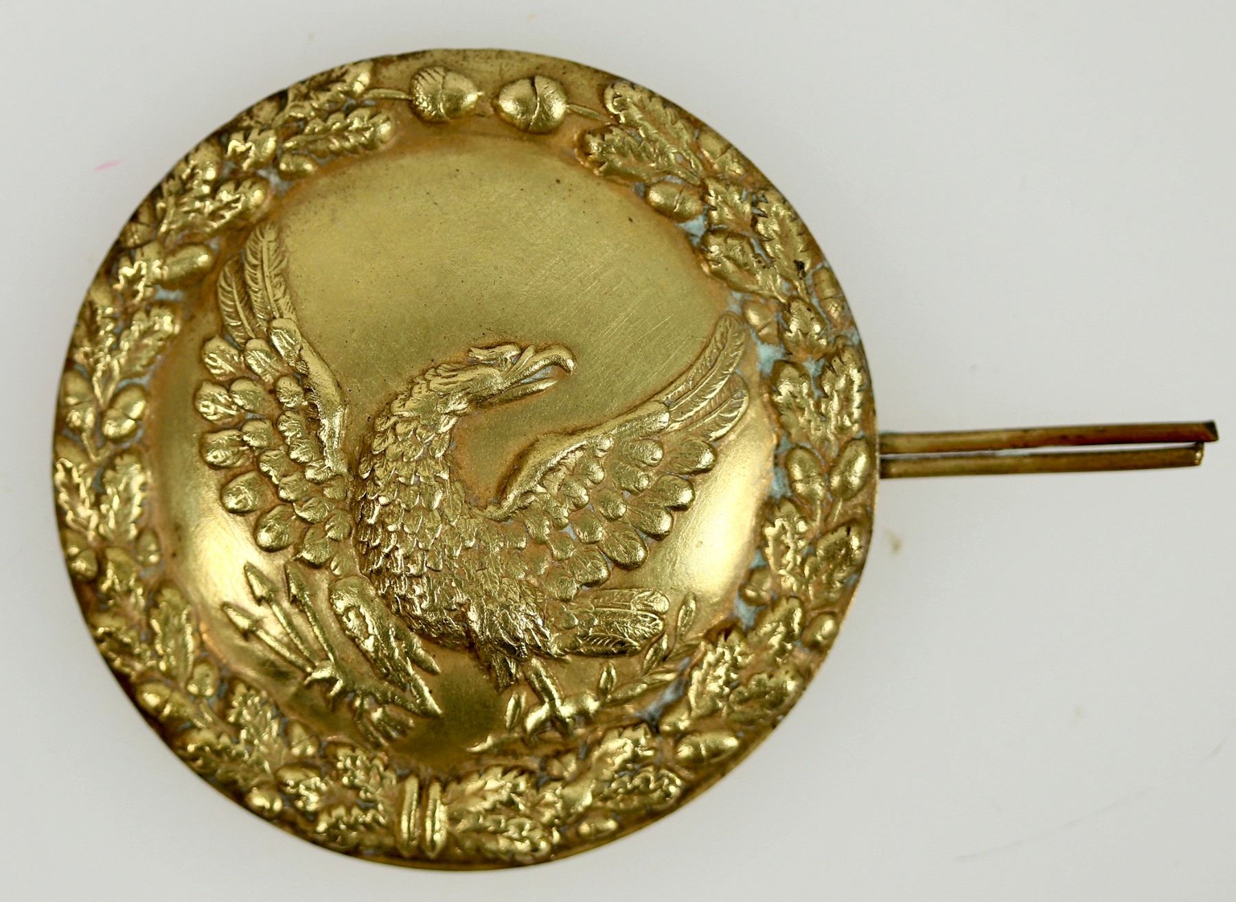 This eagle badge is from the Mexican-American war shako helmet. Made of brass at 1 9/16 in. across. With a two strand wire mounting. This was used on the sides of the helmet covering the chin strap hardware and used to identify rank. In very good condition. From the Martin militaria collection. Please see photos for details.