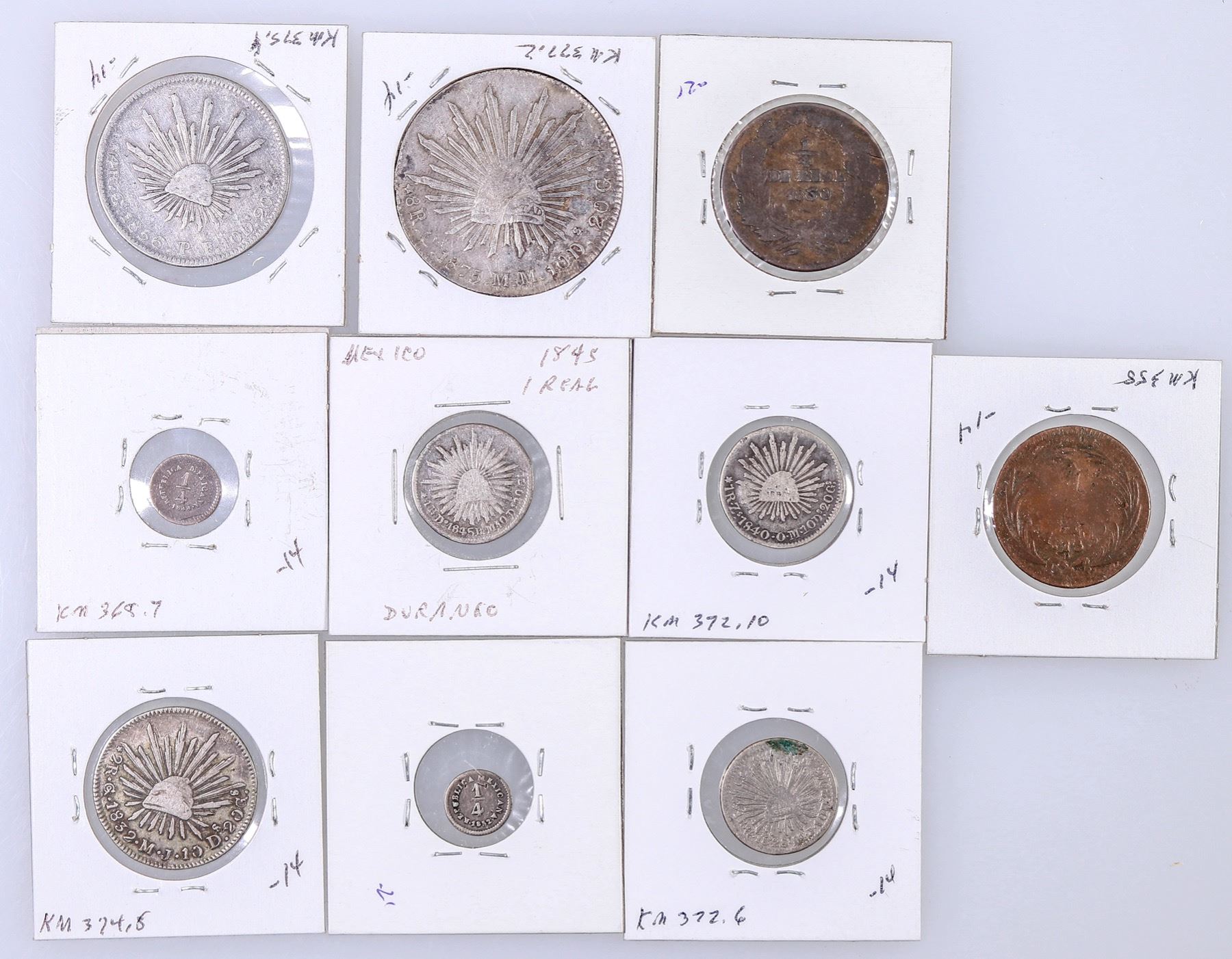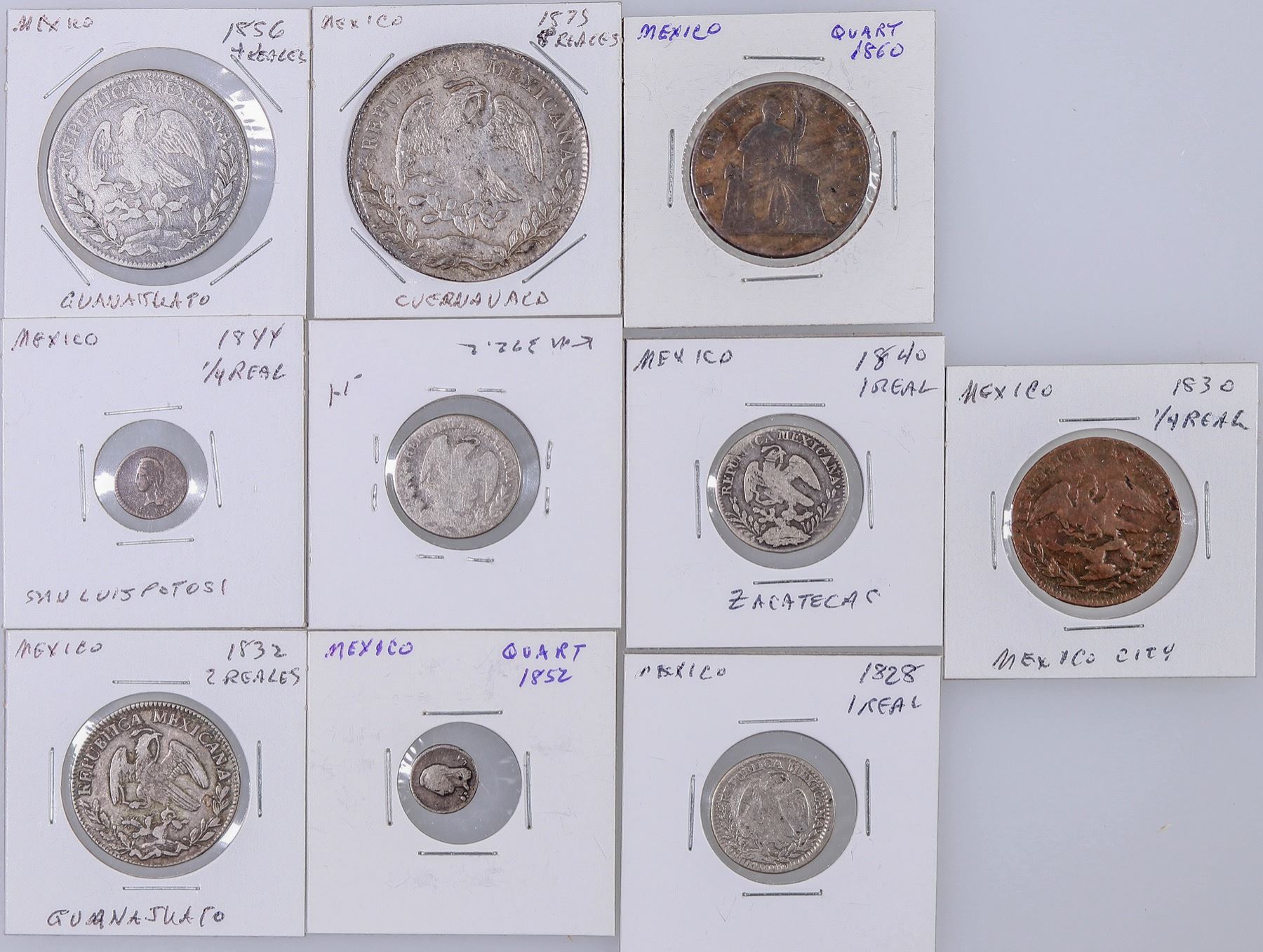 Ten 19th century Mexican coins: 1) 1828 one real, G with carbon spot; 2) 1830 1/4 real, Mexico City, AG-G; 3) 1832 two reales, G-VG; 4) 1840 one real, Zacatecas, AG-G; 5) 1844 1/4 real, San Luis Potosi, AG-G; 6) 1845 one real, Durango, AG-G; 7) 1852 1/4 real, AG-G; 8) 1856 four reales, Guanajuato, AG-G; 9) 1860 1/4 real, AG-G; 10) 1875 eight reales, Cuernavaca, AG-G.