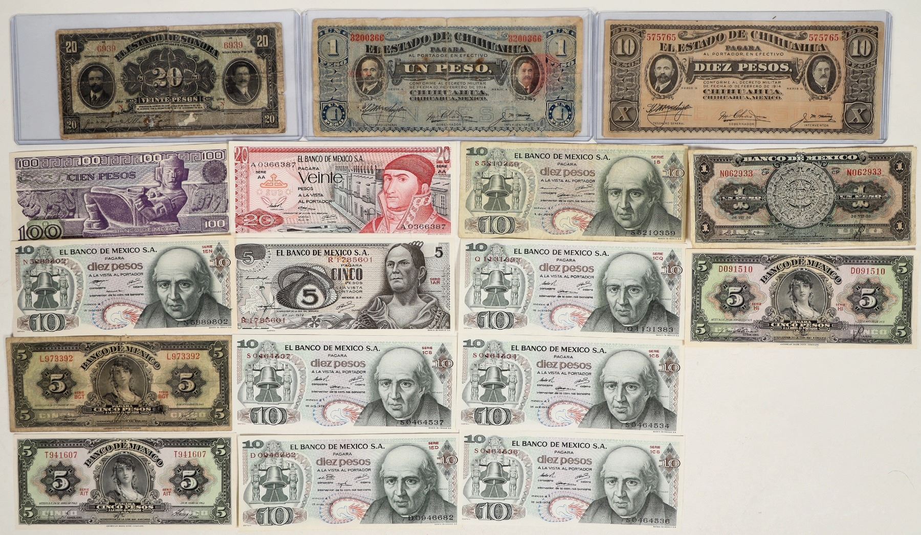 Seventeen Mexican bank notes: 1914 Chihuahua ten pesos; 1950 one peso; five pesos (4: 1963, 1972 UNC); ten pesos (7: 1969-70s); twenty peso (2: 1914 poor, 1973); one hundred peso, 1982.