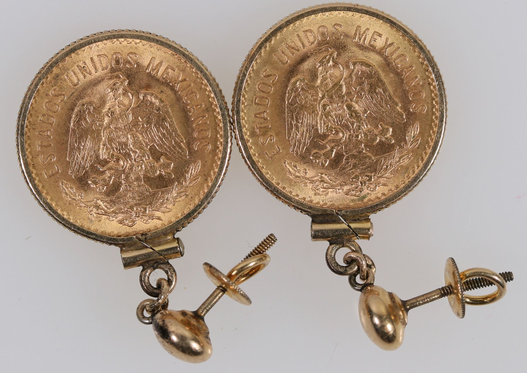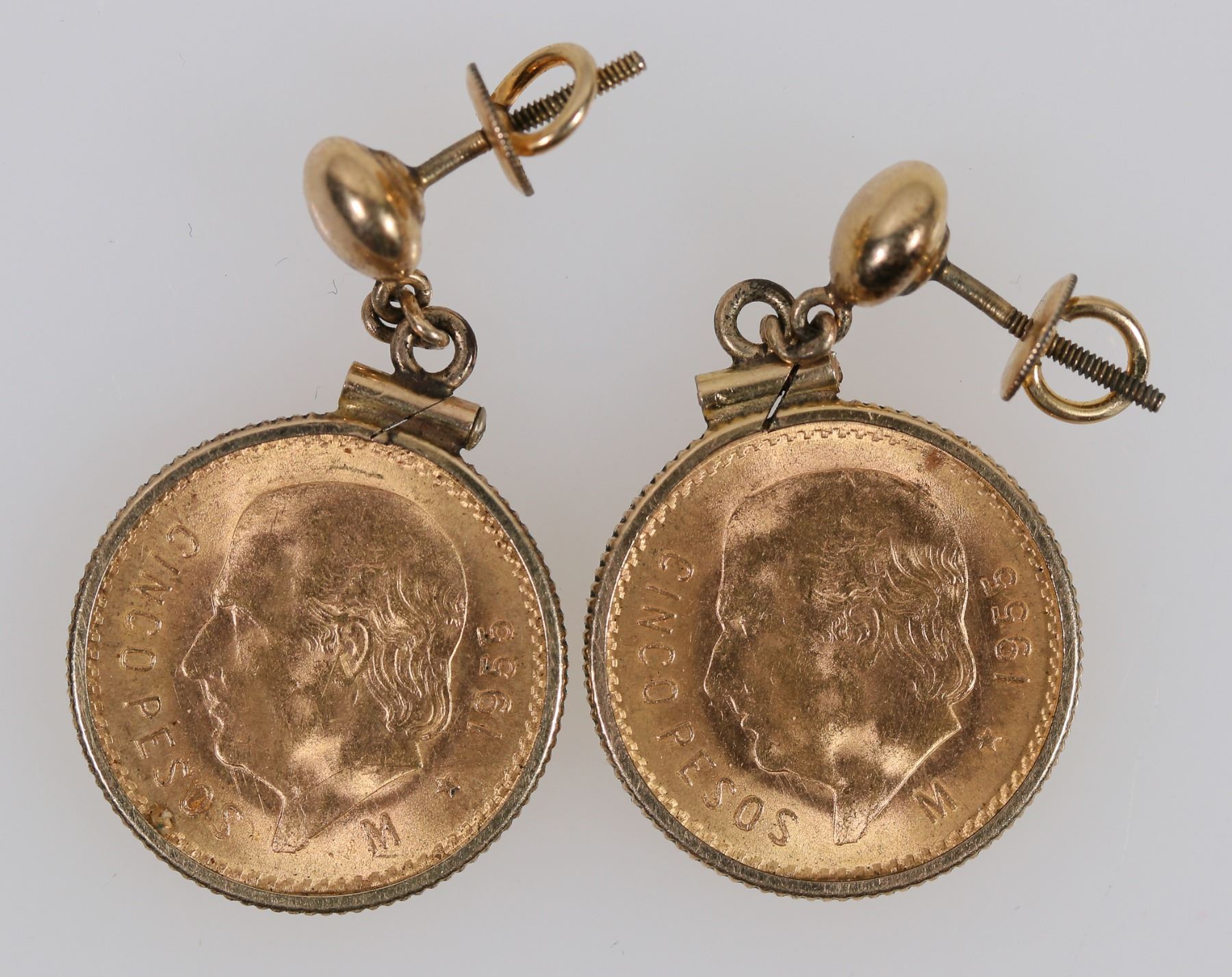 Made by a Reno jeweler, a pair of 1955 five peso Mexican gold coins secured in pierced earring mounts. Total weight of the earrings is 10.6 grams. Each coin is: Obv.: Republic eagle with lettering over it / ESTADOS UNIDOS MEXICANOS. Rev.: Miguel Hidalgo y Costilla bust looking left. CINCO PESOS / M * 1955. Edge: Smooth with lettering: INDEPENDENCIA Y LIBERTAD. Gold (.900) (10% copper); 4.1666 grams; 19 mm.