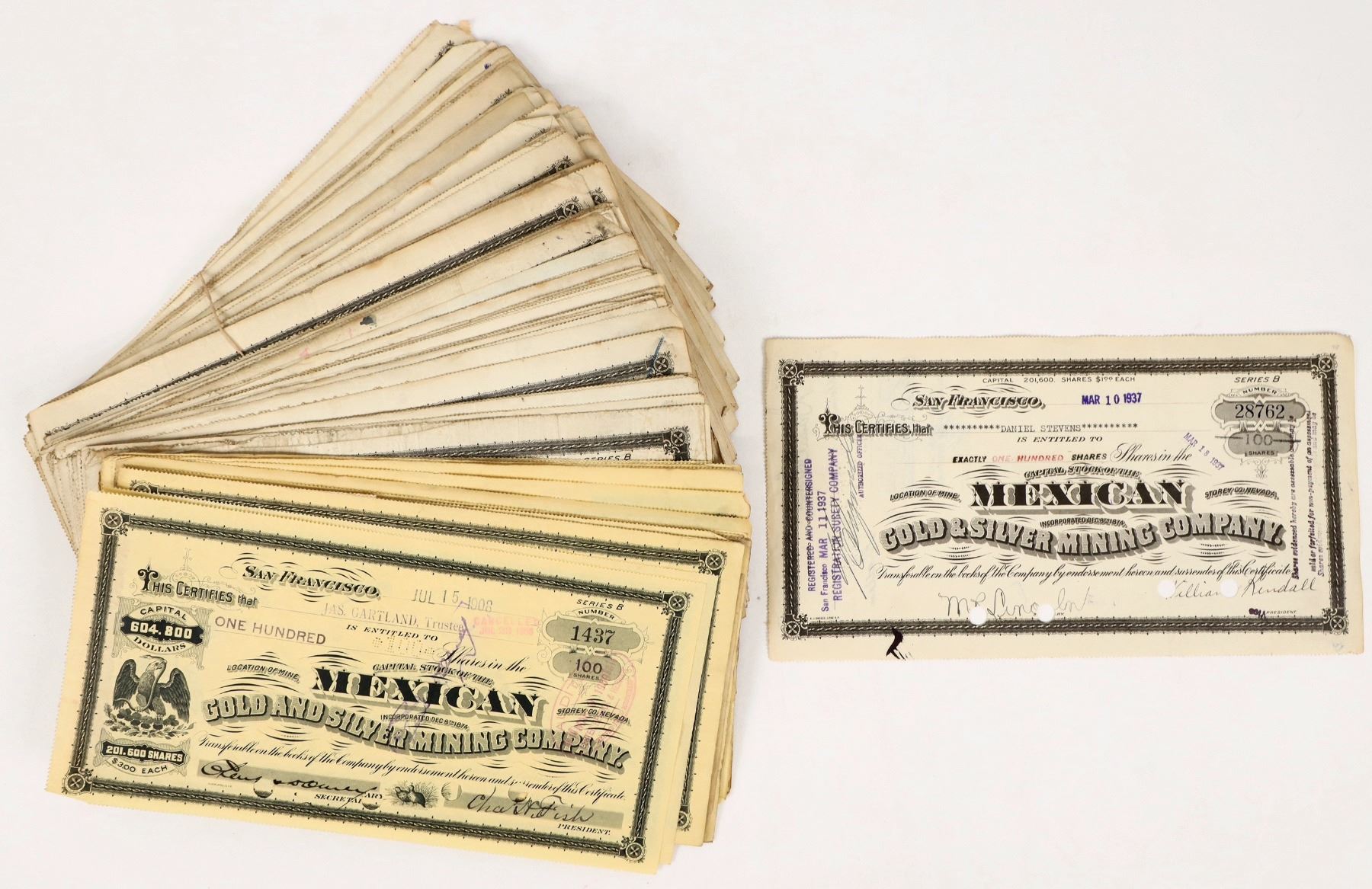 Group of approx. 200 stock certificates from the Mexican Gold & Silver Mining Company, which operated in Virginia City, Nevada. All issued 1908 to 1937, all cancelled w/ hole punched or stamped cancellations. 10.25"x5.5" certificates, significant variation in condition throughout lot; see photos.