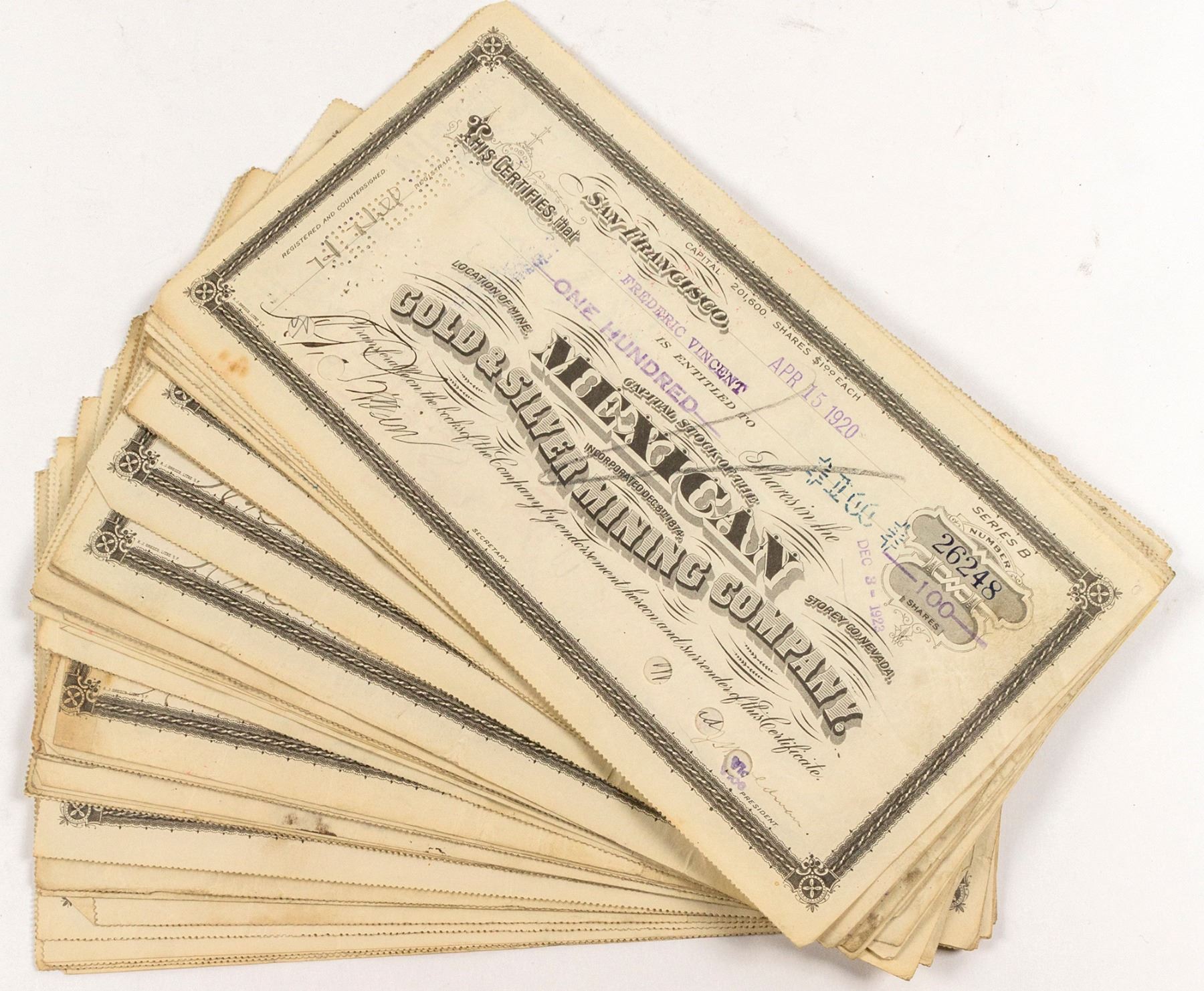 The Mexican Gold & Silver Mining Company was located at the north end of the Comstock district and was a major producer gold & silver. The 40 certificates included here are all cancelled, some with assessment stamps, a few with revenue stamps Ken Prag Collection