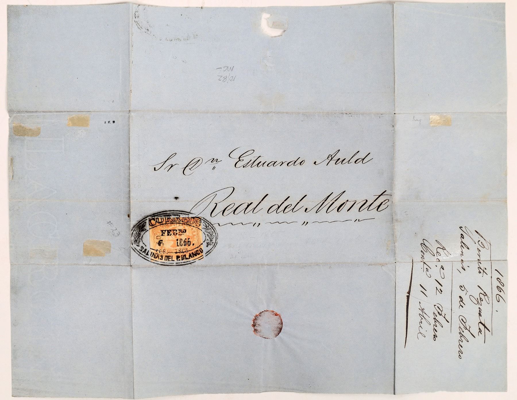 Mexico 1865 lettersheet to Real del Monte franked with Eagle 2r (S.L. Potosi 208-1865, suboffice 10, four margins) tied by sharp Salinas del Penon Blanco Feb 6 oval datestamp, earliest recorded use from this suboffice per Pietsch, very rare suboffice use. Mexico Gary Bracken Collection