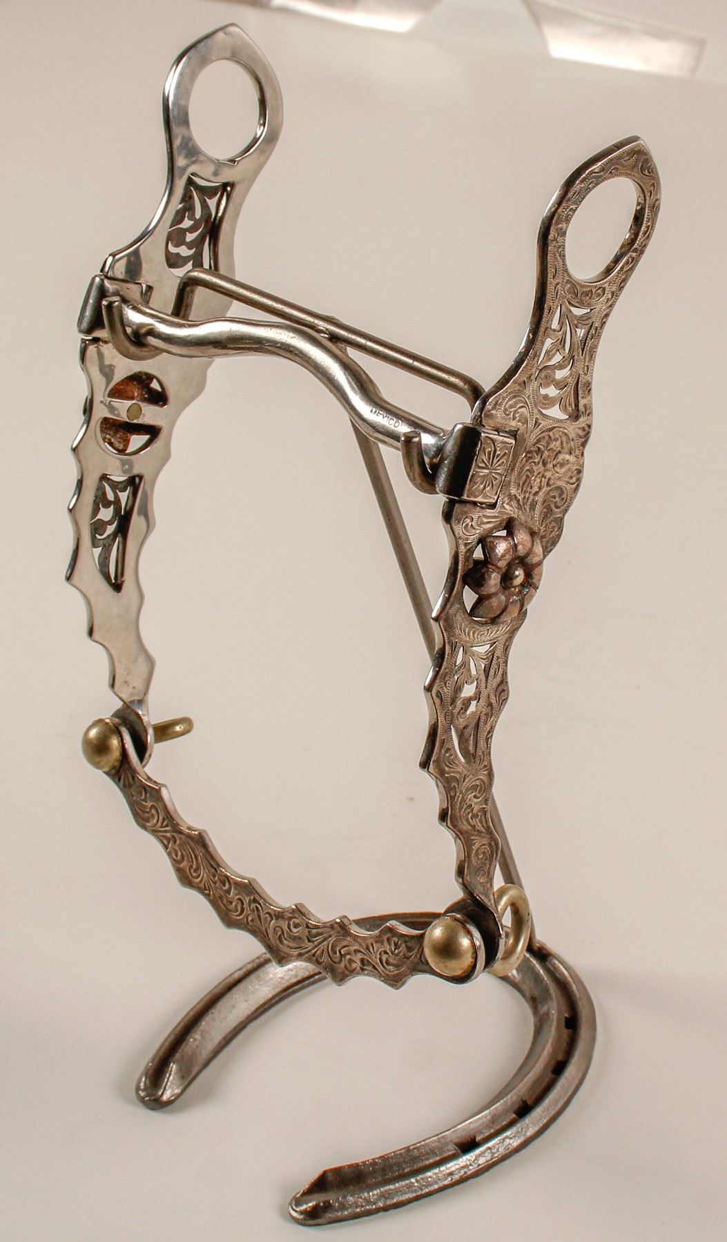 Silver inlaid with some piercing of a floral pattern on the cheeks and nice floral buttons. This is somewhat of a Mullens style mouth piece at 5” wide, nice inlay work on lip bar with great patina on the silver, about 8” from top of bridle rings to base of lip bar. Date: City: State: HWAC# 62014