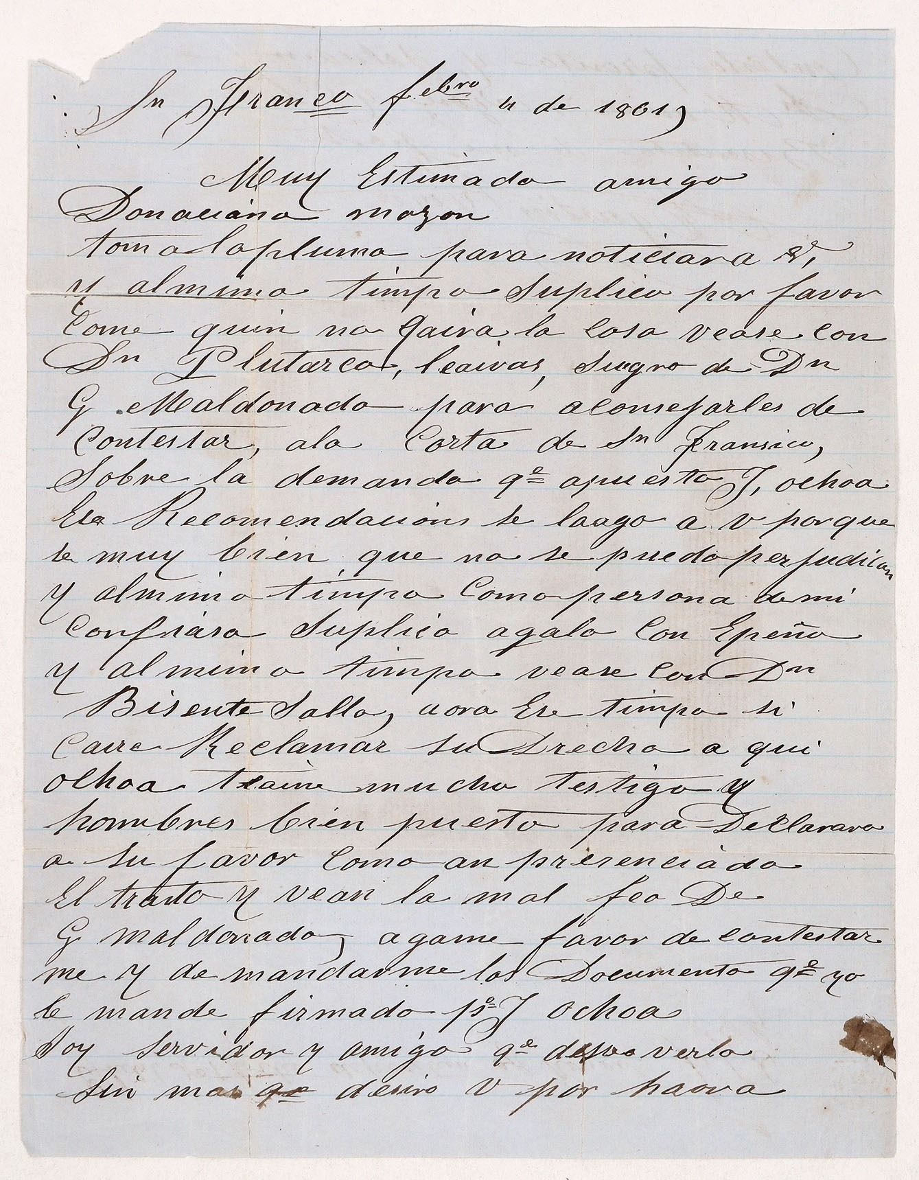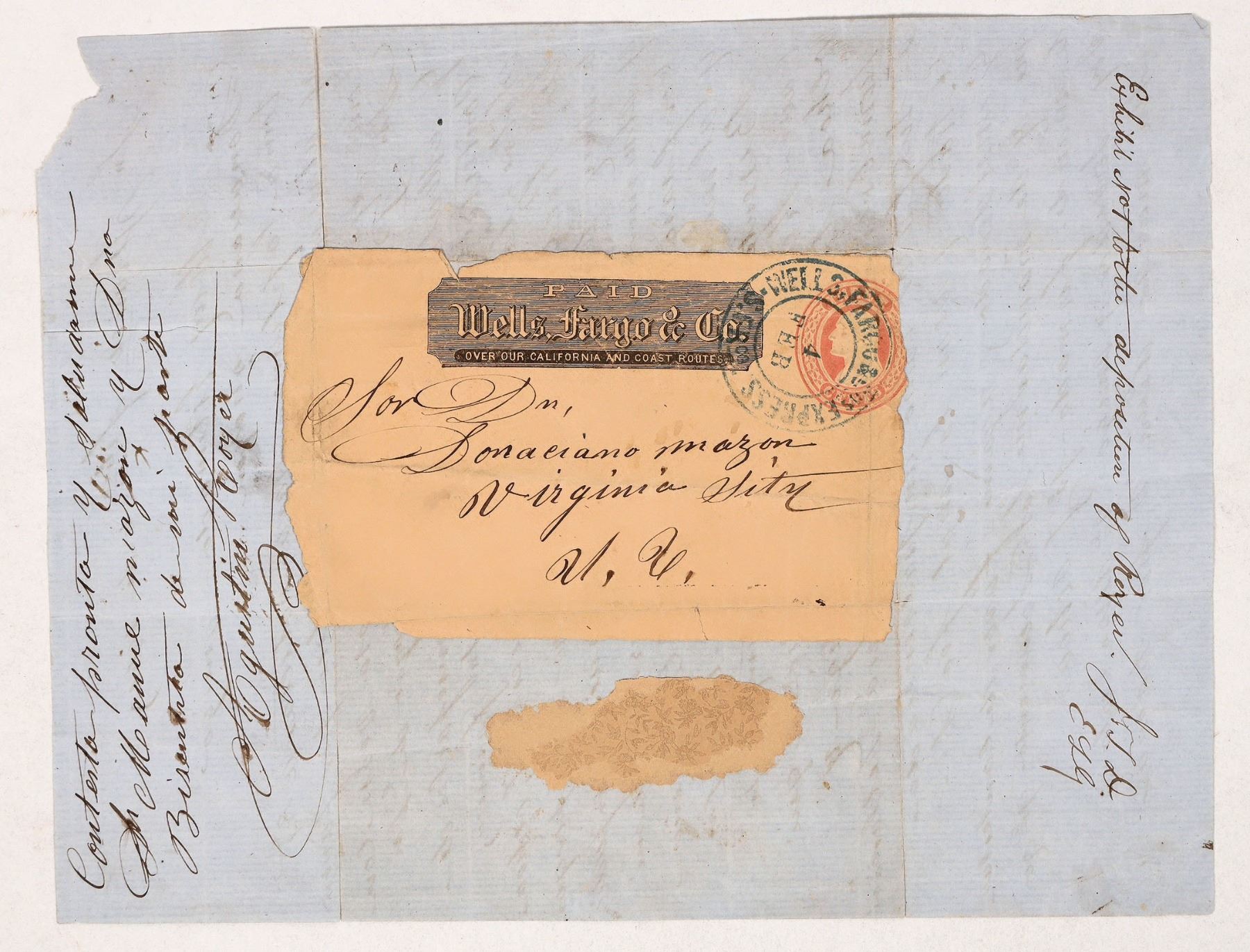 Letter is datelined In Franco, February 4, 1861. Cover has an address of Feb. 4. Yet how can a Wells Fargo cover come from France. and why has the cover been glued on to make this a coverless letter? Letter is from Augustin Roger and addressed to Donacio Marzon. Something happened to G Maldonado (ugly bad treat) and this letter seems to be trying to get to the bottom of it. Accompanying documentation shows the Maldonado brothers owned the Mexican mine and sold it in 1863. The Maldonado Brothers and their Mexican American workers used pre industrial techniques to excavate on of the most profitable healthy Comstock Mines [James] Perhaps it is from the French consulate in San Francisco. Letter is in French, but is accompanied by translation.