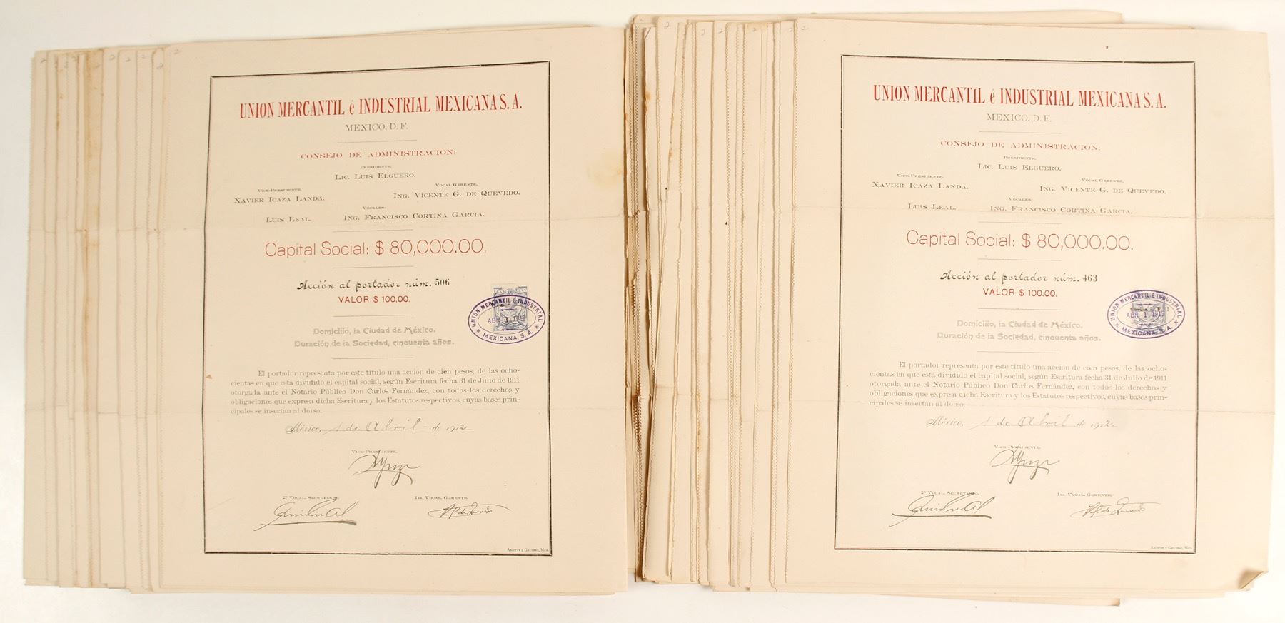 Approx 40 Union Mercantil e Industrial Mexican SA bonds Date: 1912 Location: Mexico HWAC# 69027