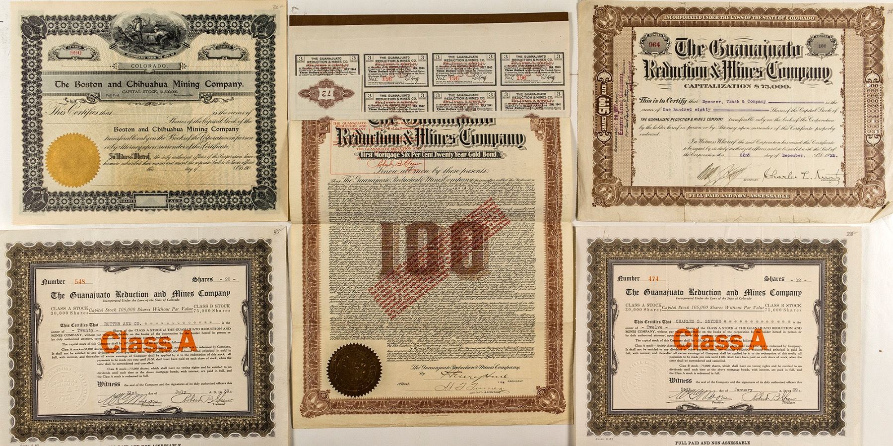 Lot of five. Includes: 1) The Guanajuato Reduction & Mines Company. Four pieces. Three stocks, two different, issued 1922 & 1939, not cancelled. Inc. in Colorado. Plus a $100 bond issued 1904 with nine coupons attached. 2) The Boston & Chihuahua Mining Company. 190- unissued stock. Inc. in Colorado. (Prag Collection). HWAC# 34450 Date: 1904-1939 Location: zMexico