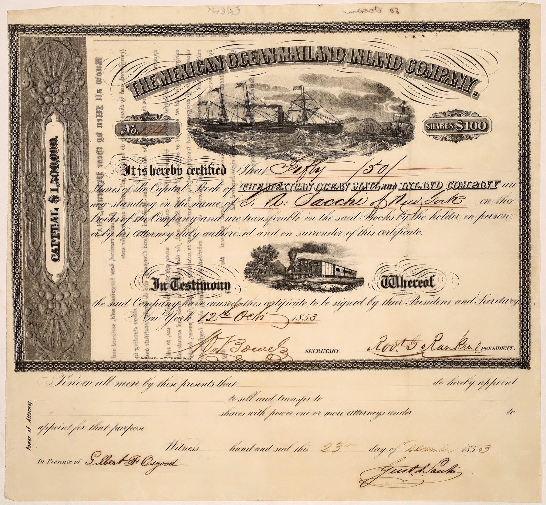 Look at this beautiful thing. Great vignette of two sailing ships in rough seas. Cert. #184, issued for 50 shares and signed by the company officers. The company operated mail transportation on the Mescala River in Mexico. The company also contracted with the U.S. government to carry mail from Vera Cruz to San Francisco. VF. Uncanceled.