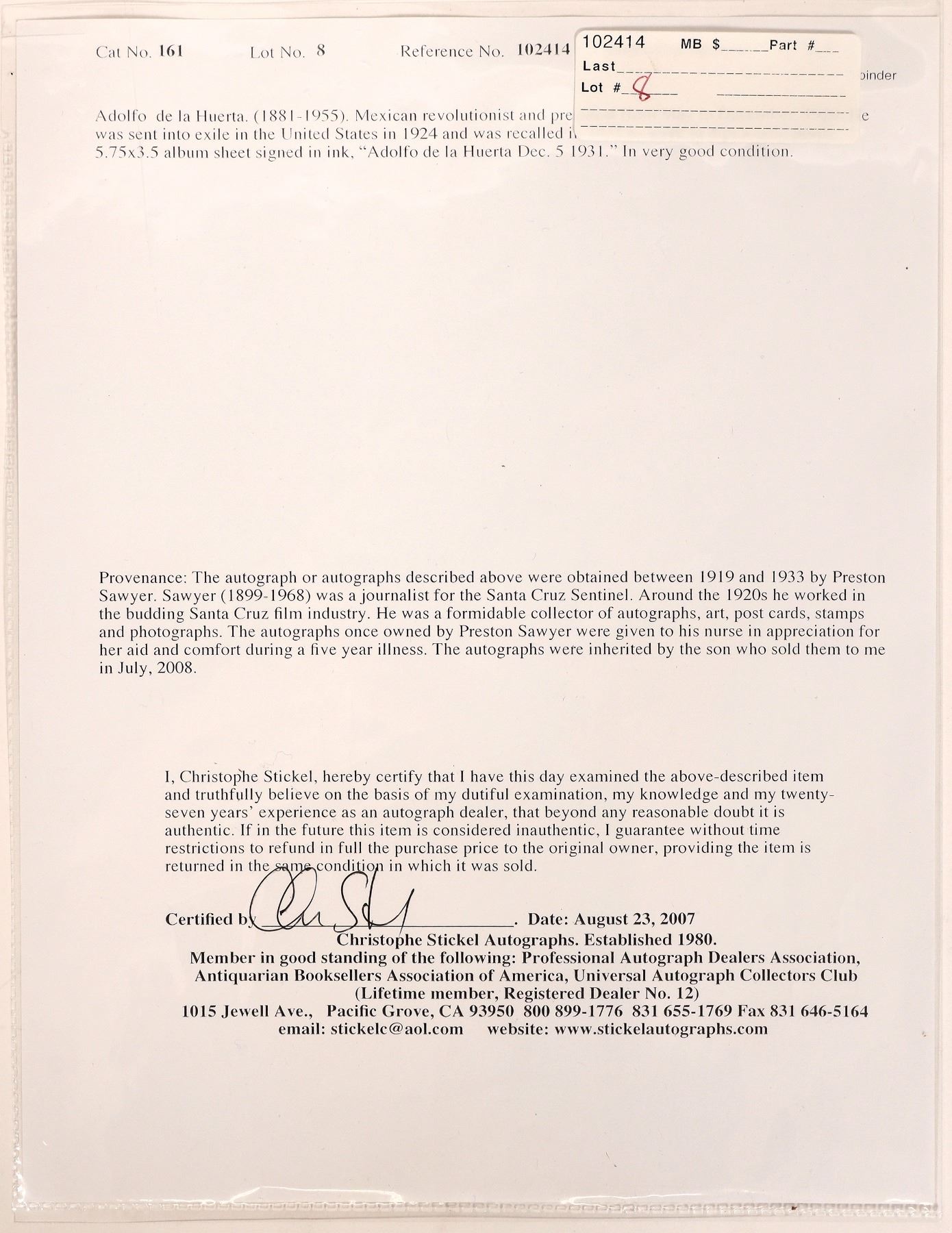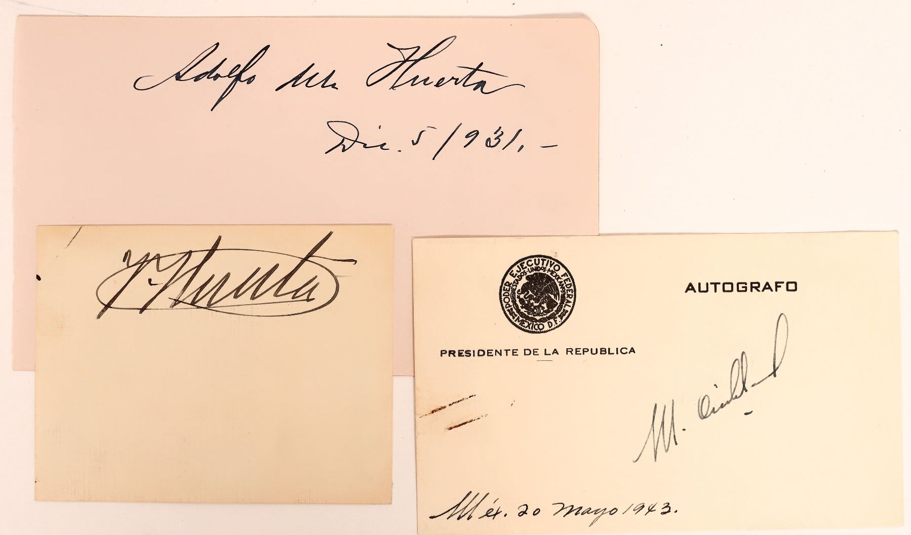 Mexican president autographs (3). Included are a pair of autograph cuts from Victorino Huerta who was president from May to December, 1920 before being exile in the United States. Also included is an autograph cut of Manuel Avila Camacho, who served from 1940-1946. All in nice condition. Please see photos for more details.