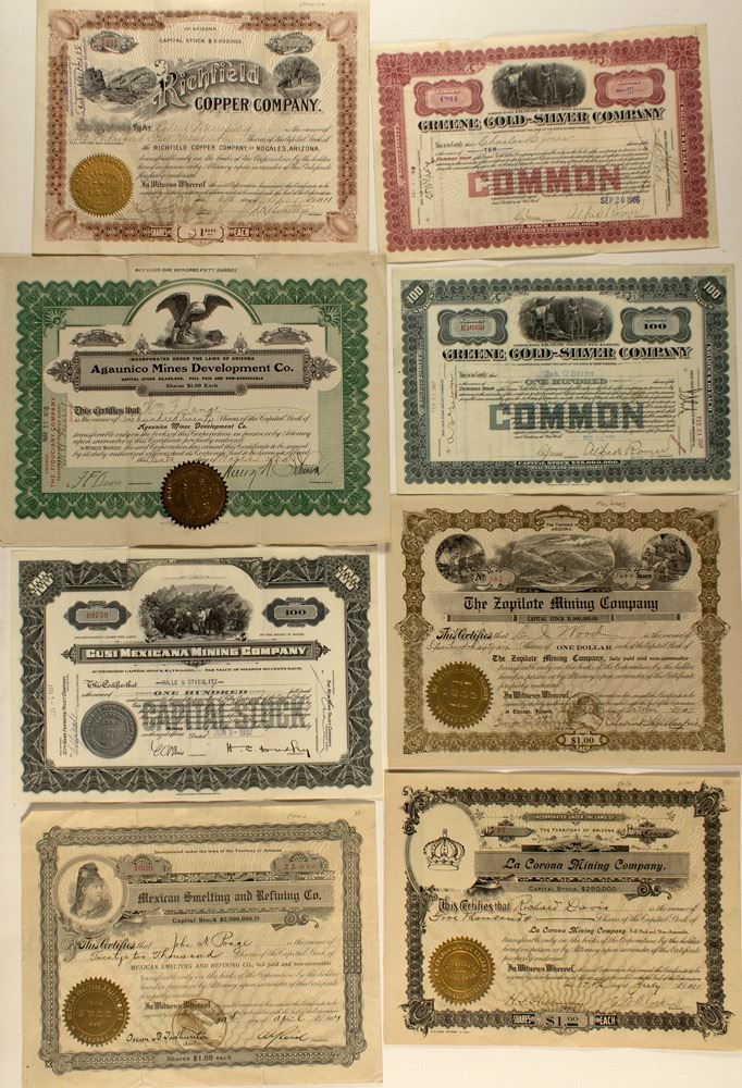 Lot of 8. Greene Gold-Silver (two different), Richfield of Nogales, Agaunico, Zopilote, La Corona, Mexican Smelting and Refining (22,000 shares to John Poage), and one 1930's Cusi Mexicana Mining. Vignettes range from underground mining to eagles to crowns to Spanish ladies. (Prag collection) City: State: zMexico Date: 1906-1911 ID# 23866