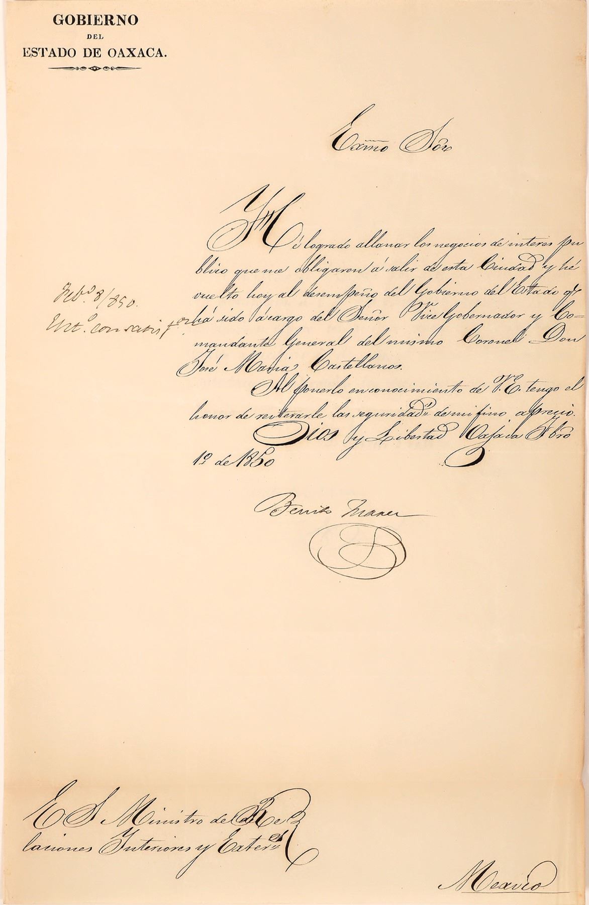 Letter signed by President Benito Juarez of Mexico. Juarez is often called "The Abraham Lincoln of Mexico" because of policies that were enacted during his terms in office, including separating the Catholic Church from government affairs and being instrumental in La Reforma.