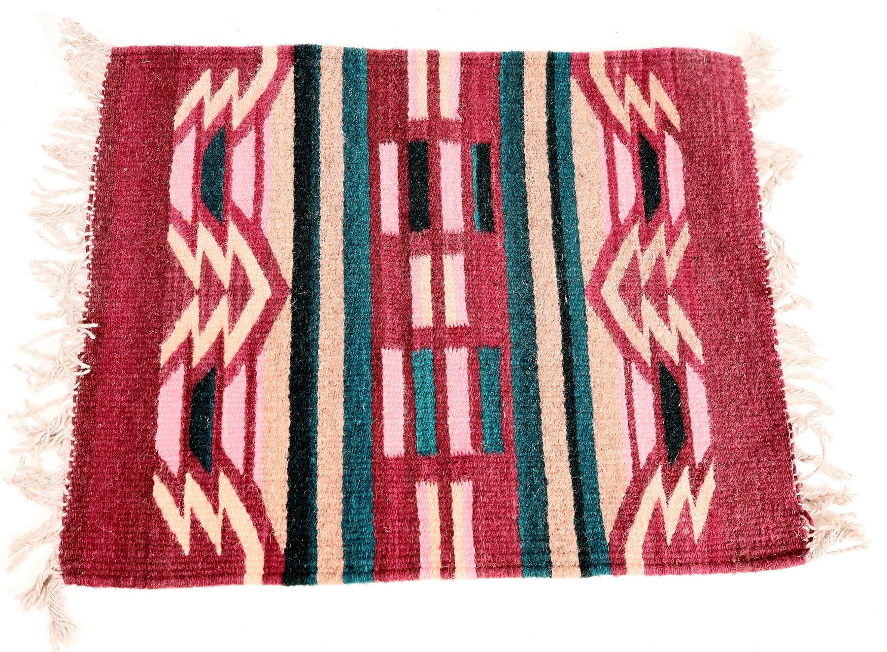 7 Mexican rugs. Red, grey, white accents 59x28", fair condition. Black, ruby, beige 63x25". Turquoise, red diamonds, black 59x33" stained. Black, brown, beige 64x44". Beige, green, orange, aqua 75x47" poor condition. Purple, mauve, turquoise 19x16". Red, green, yellow, black, white 70x40" poor condition.