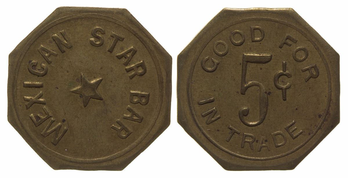 Mexican Star Bar // GF / 5c / IT. Octagonal, brass, 24mm. Unlisted denomination. State: Montana City: Billings Date: FHWAC#: 41547