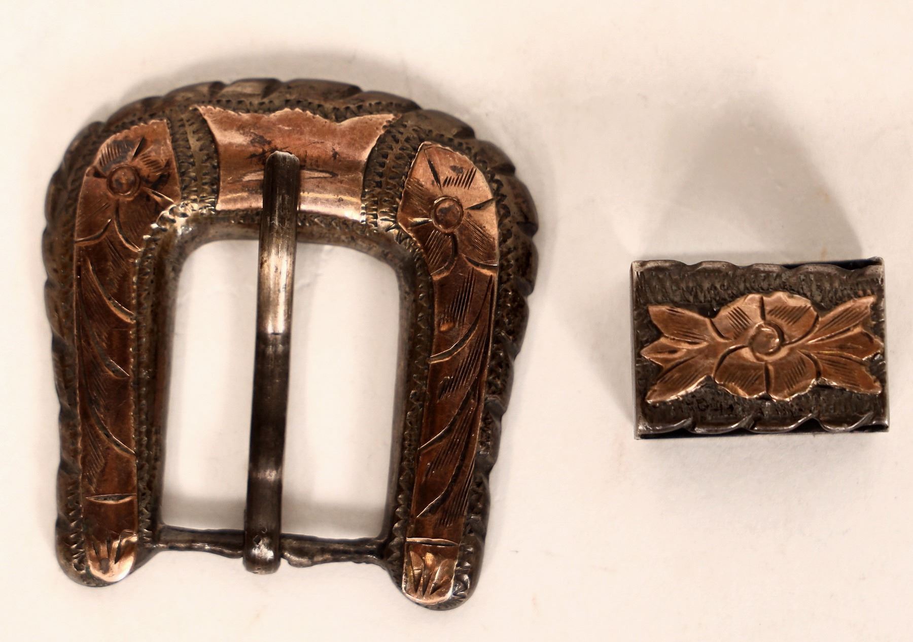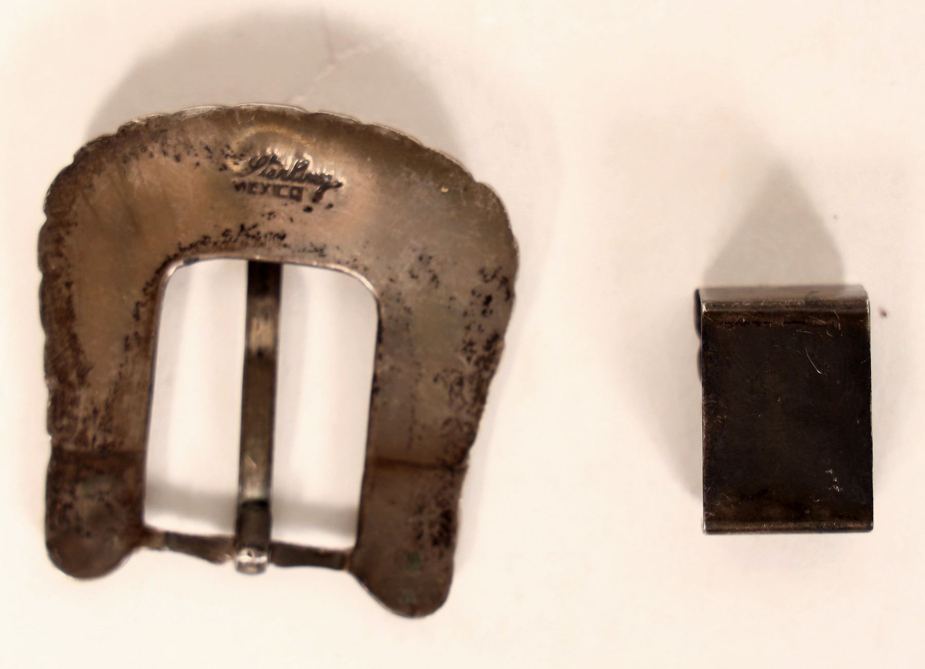 Vintage ladies' sterling silver belt buckle from Mexico with decorative copper embellishments. Measures 1.5" x 1.5" with a matching .75" x .5" x .5" sterling silver belt loop. Buckle stamped "Sterling Mexico" on back. [Mexico]