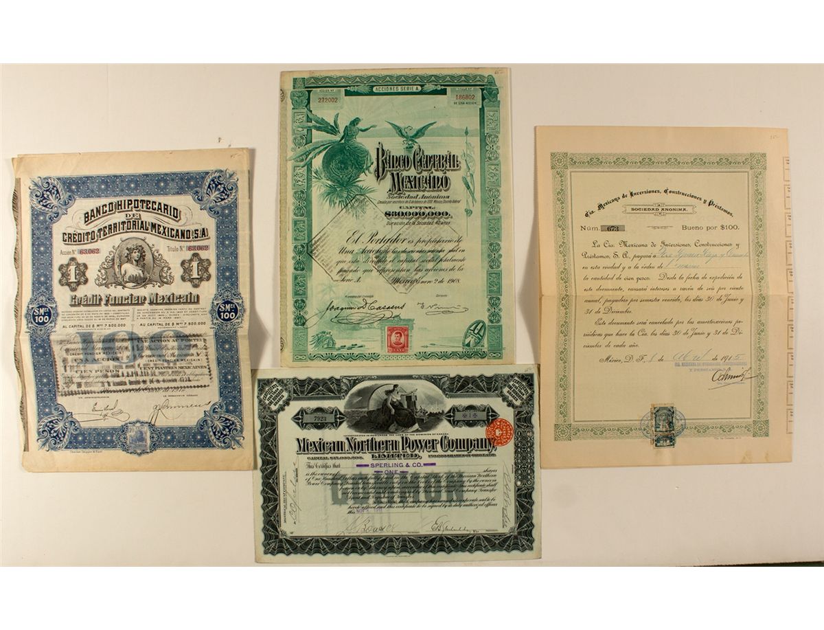 Four certificates: Banco Central Mexiicano, Sociedad Anonima, 1908, No. 272002. Revenue stamp.
