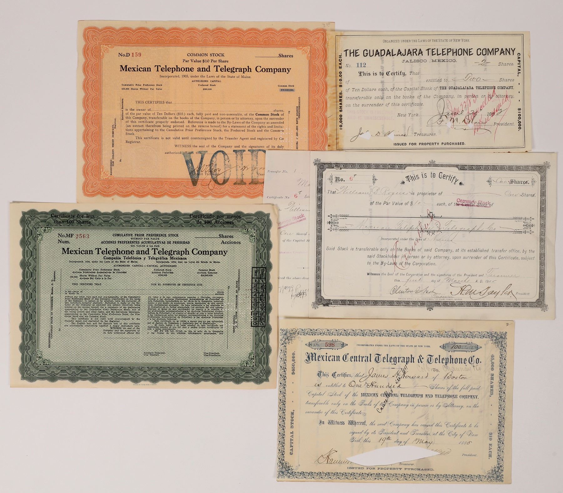 A mini collection of six old different stock certificates from Mexican telephone & telegraph companies, c1882-1905. Please see photo(s) for more details.
