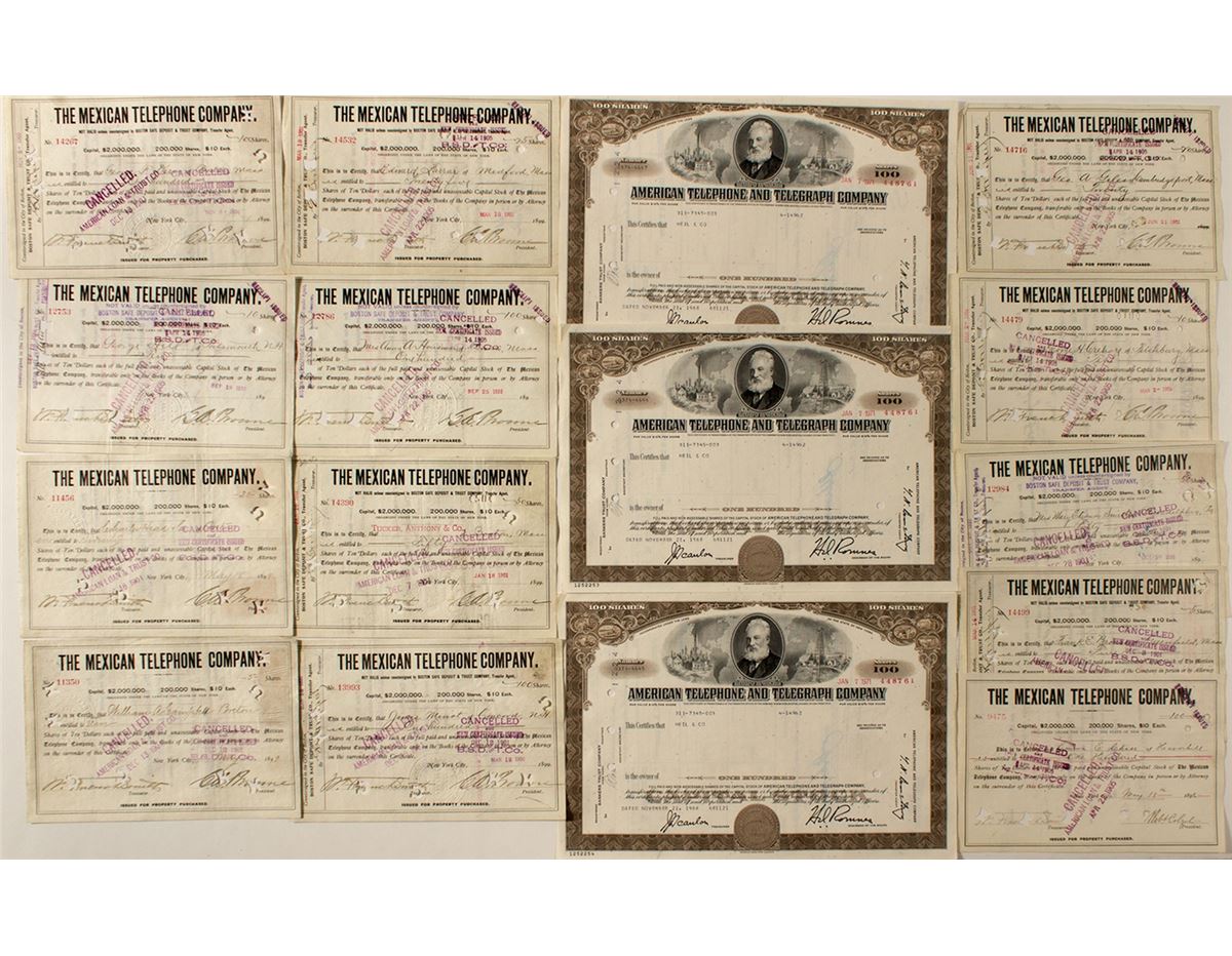 Twelve Mexican Telephone Company stocks 1896-1901. All sold to East Coast shareholders. Mexico’s first telephone line was erected in Puebla in the early 1880s. Before long, the Mexican Telephone Company, a subsidiary of Bell, was operating in Mexico City. The first telephone lines did not work very well and were limited to downtown areas. Only public officials, police stations, a few select businesses and the wealthy used the telephone service. The growth of telephony was slow because it lacked strong government support, was expensive and had a very limited range. By 1893 telephone services had spread to 13 more cities even though intercity lines would not become available until much later. Also three American Telephone and Telegraph Company stocks 1968.