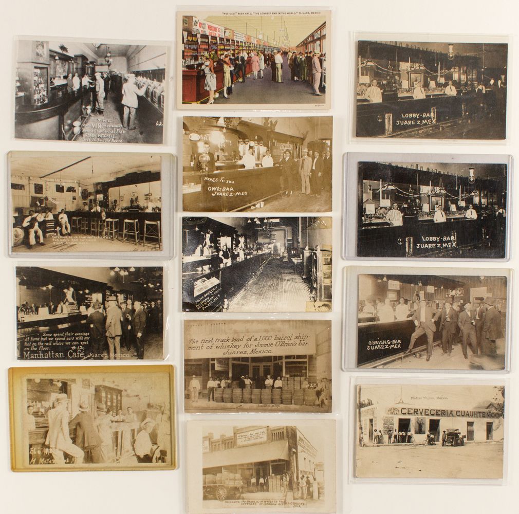 From the Ken Prag collection: a set of 13 Mexican saloon postcards, mostly b&w photos of interiors.