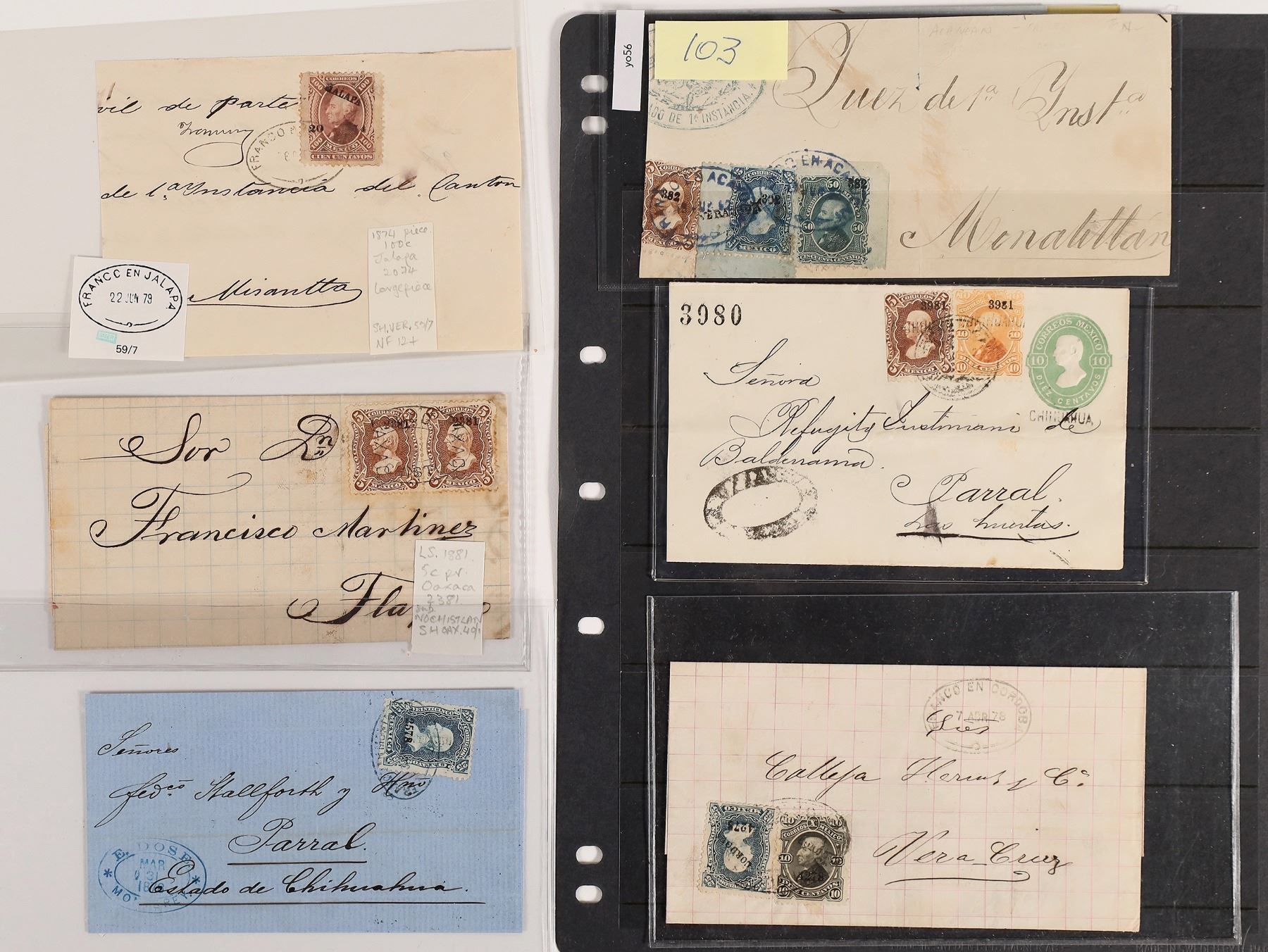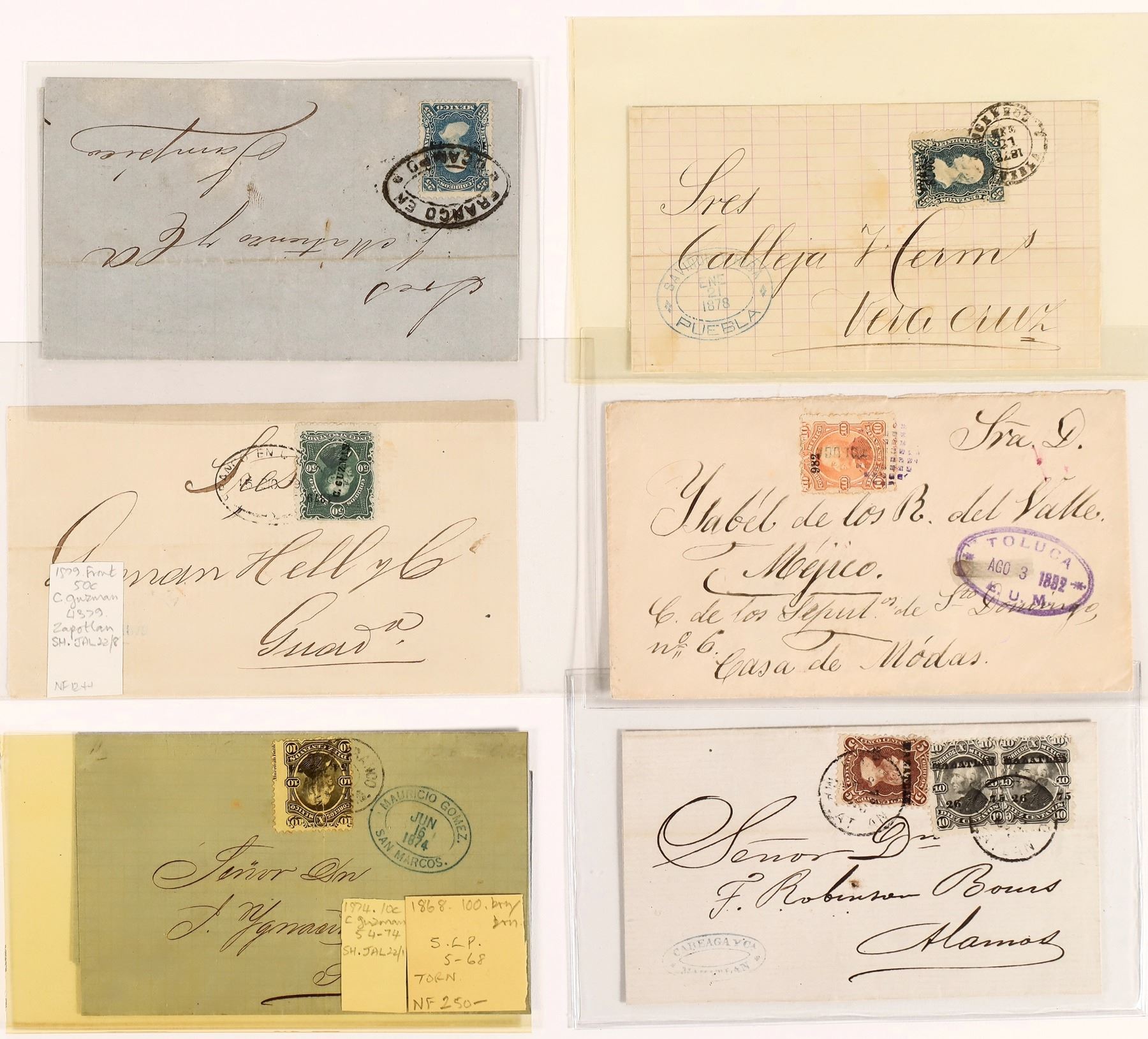 Mexico. 1874-81 Hidalgo issues, 12 covers, from Acayucan (front) ,Chihuahua, Cordoba, Jalapa (x2, one with 100c on large portion of front only), Mazatlan, Monterey, Nochistlan, Ocampo, Puebla, Toluca, Zapotitlan, , good variety of stamps, please see scans.