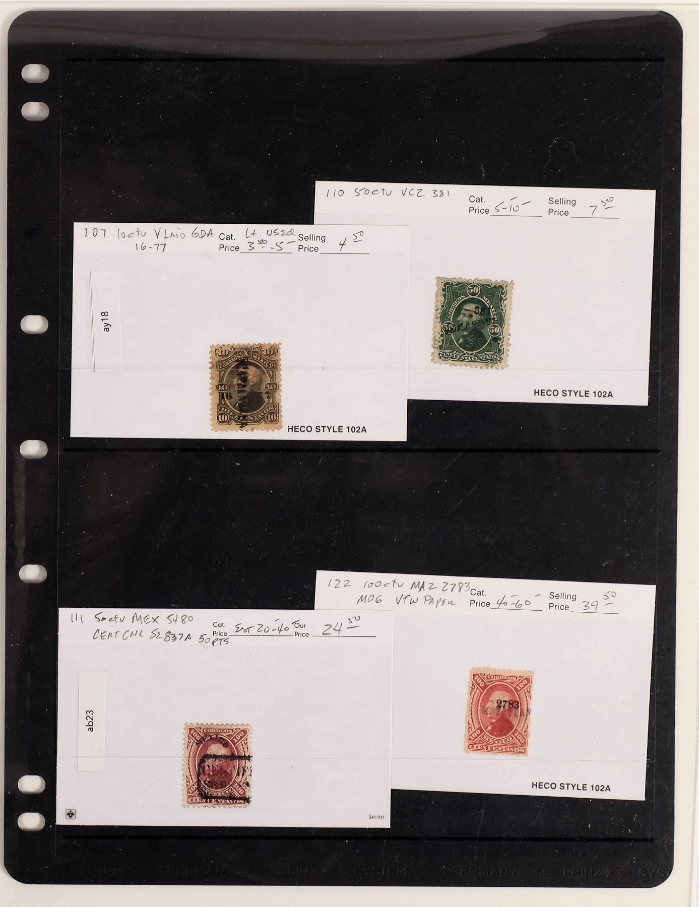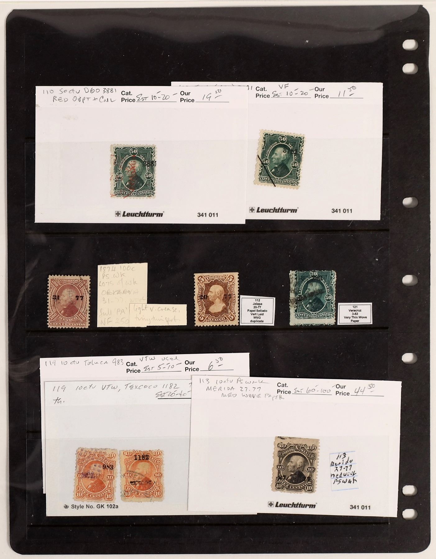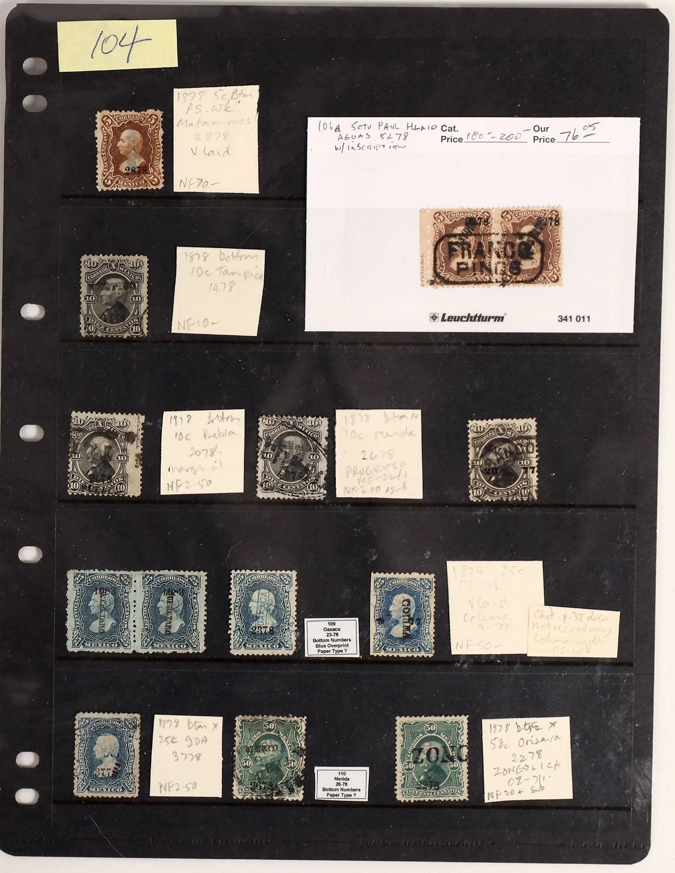 Mexico. 1874-81 Hidalgo issues, two stock sheets with 27 stamps, highly annotated, noted 5c inscription pair with complete FRANCO PINTOS cancel, 100c (x3, one mint), etc., will repay careful examination.