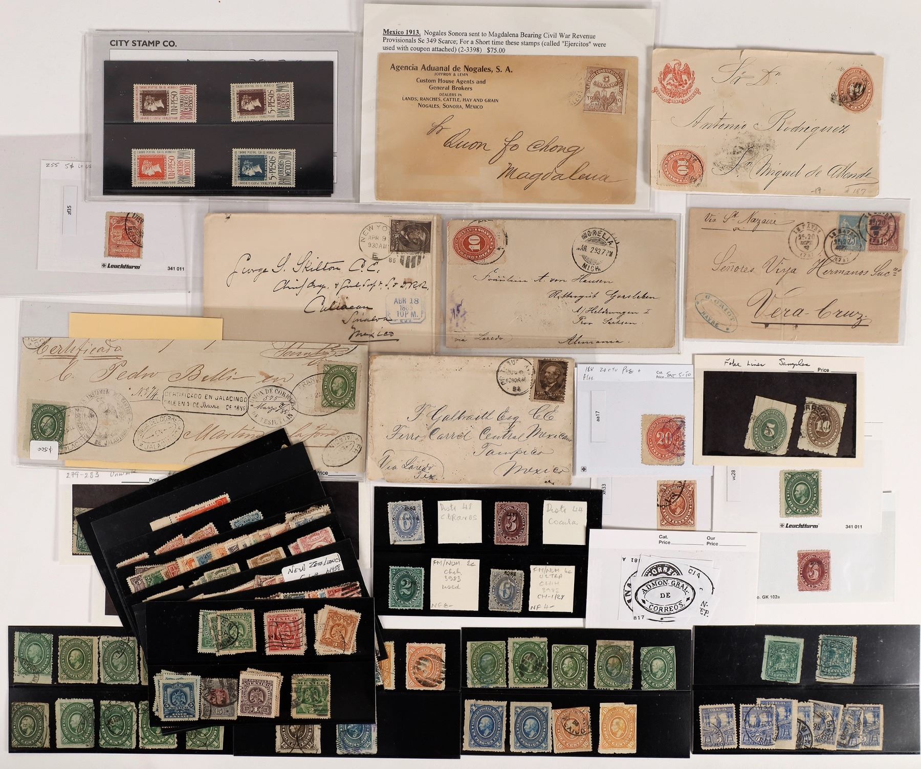 1882-1940 very varied balance, noted 1895 Mail Train 5p, 1913 cover with "Ejercito"5c (#349), 1940 Stamp Centenary set mint, decent Numerals, 1884-5 Hidalgos, etc., take a look! Seven covers and dozens of stamps.