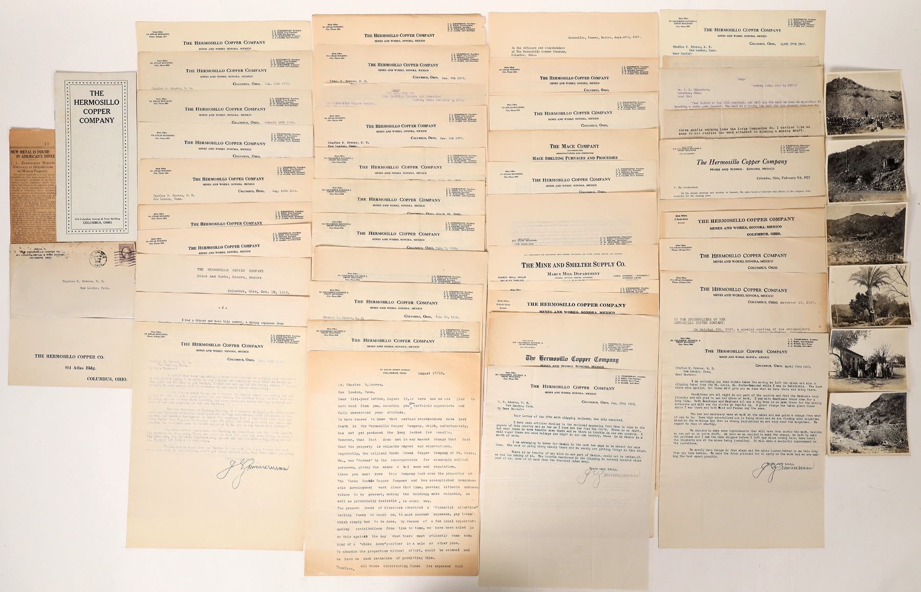 Contains a number of correspondence and covers from the Hermosillo Copper Company in Hermosillo, Mexico. This typed correspondence includes letters to stock holders, smelting facilities and other entities dealing with the operation of the mine. All in very nice condition. Mexico Hermosillo 1920s [Hermosillo] [Mexico]