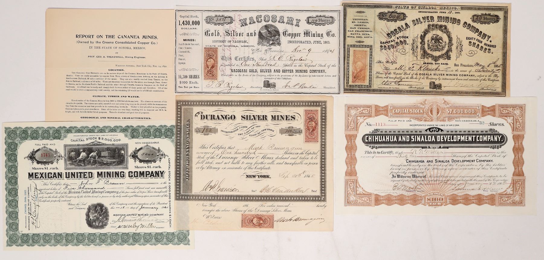 5x stock certificates belonging to California-based companies operating mines in famous silver mines in Mexican state of Sinaloa and includes a report on the Cananea Mines by Prof. Geo. A. Treadwell. These are from one of the most, if not the most, important silver mining areas in Mexico and are a showcase of American interest Mexican mining.