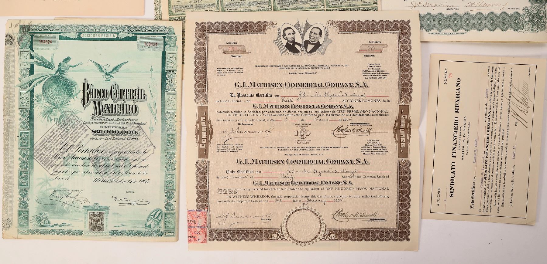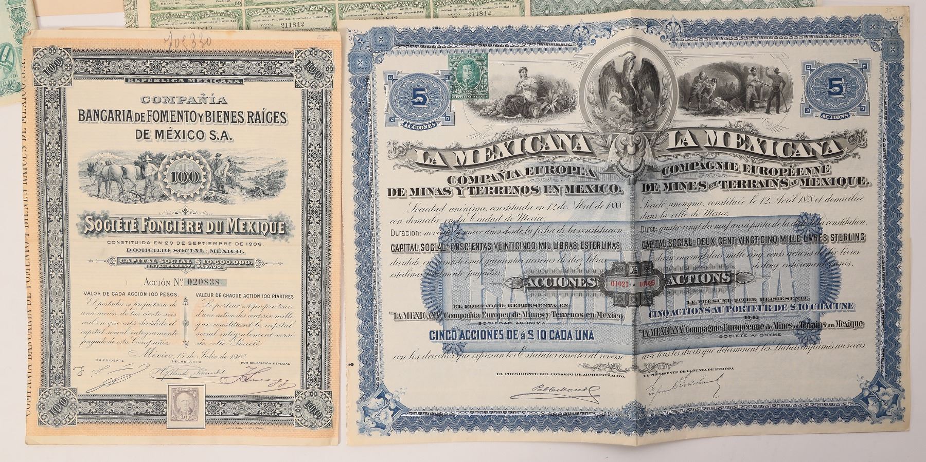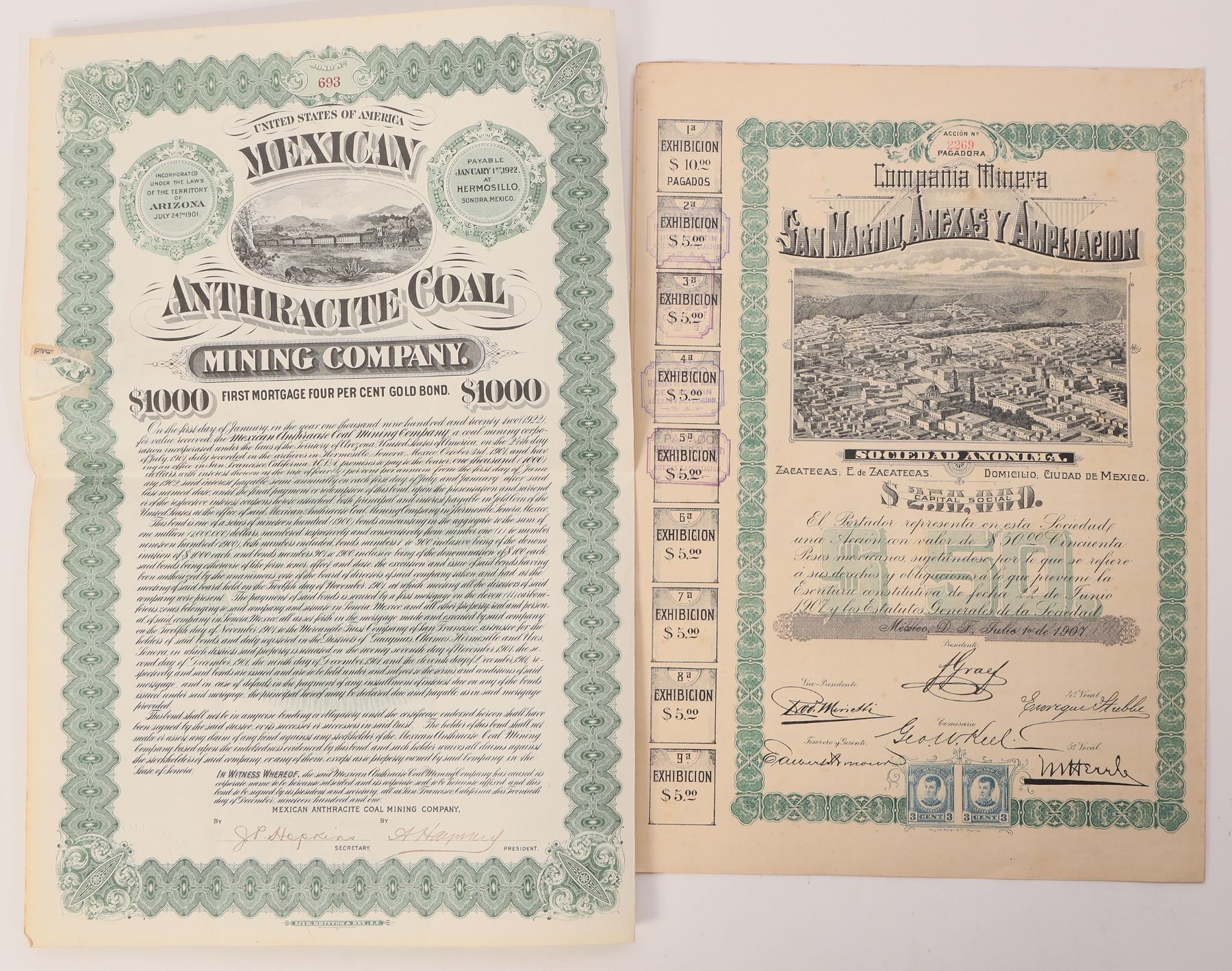 Lot of 11. Various mining stocks, all have coupons, some have revenue stamps imprinted & affixed. Printers include : American BNC, A. Gast & BNC, Britton & Rey and Waterlow & Sons Limited.
