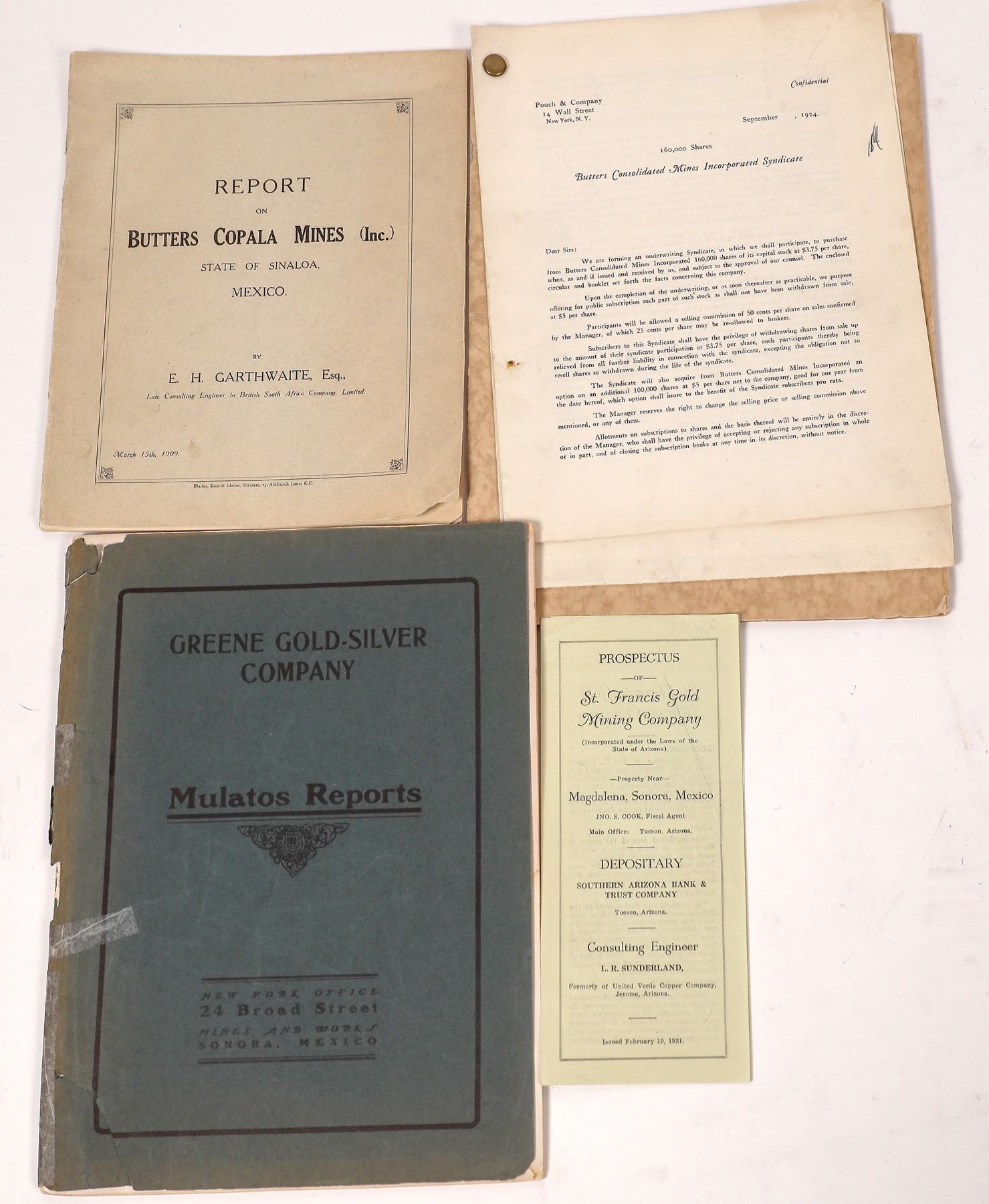 D) Butters Consolidated Mines Incorporated investor booklet from 1924. This booklet contains fact about the company and its mines. There is a letter attached to it from Pouch and Company detailing their desire to purchase 160,000 shares of capital stock. 12 x 9, good condition.