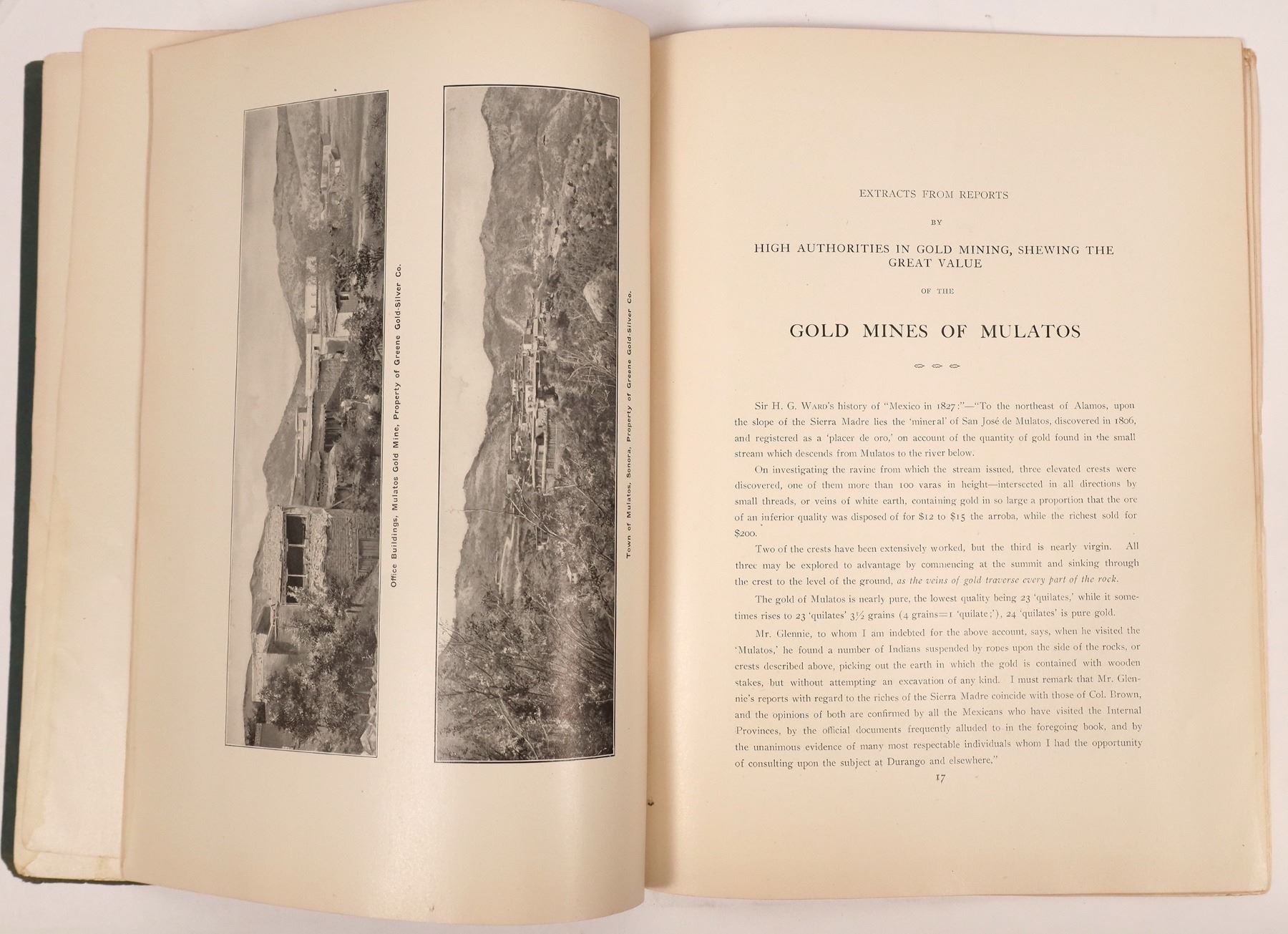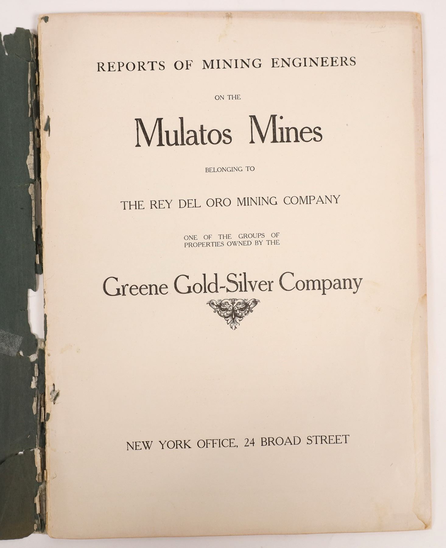 A) Reports of Mining Engineers on the Mulatos Mines Belonging to the Rey Del Oro Mining Company, one of the Groups of Properties Owned by the Greene Gold-Silver Company. This report includes a map compiled by the Greene Gold-Silver Co. from Surveys Made by the Sierra Madre Land and Lumber Company and the Cananea Consolidated Copper Company in the back. 12 x 8.75, good condition, cover is damaged and taped.