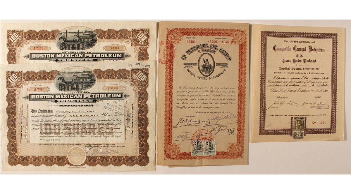 Group of two stocks and two bonds. 1) Boston Mexican Petroleum, No. 2169 and 3910, issued in 1920 and 1923. Cancelled by stamp and hole punch, with nice loading rack, Panuco River vignette at center top. 2) Compania Central Petrolera bond No. 8174, issued December 30, 1913. Tied Mexico revenue stamp at center bottom, with exhibicion no. 1-10 stamped on reverse. 3) Petrolera Del Panuco bond 49401 issued March 18, 1914. Two tied Mexico revenue stamps at center bottom with 30 coupons still attached. Date , zMx hwac 20903