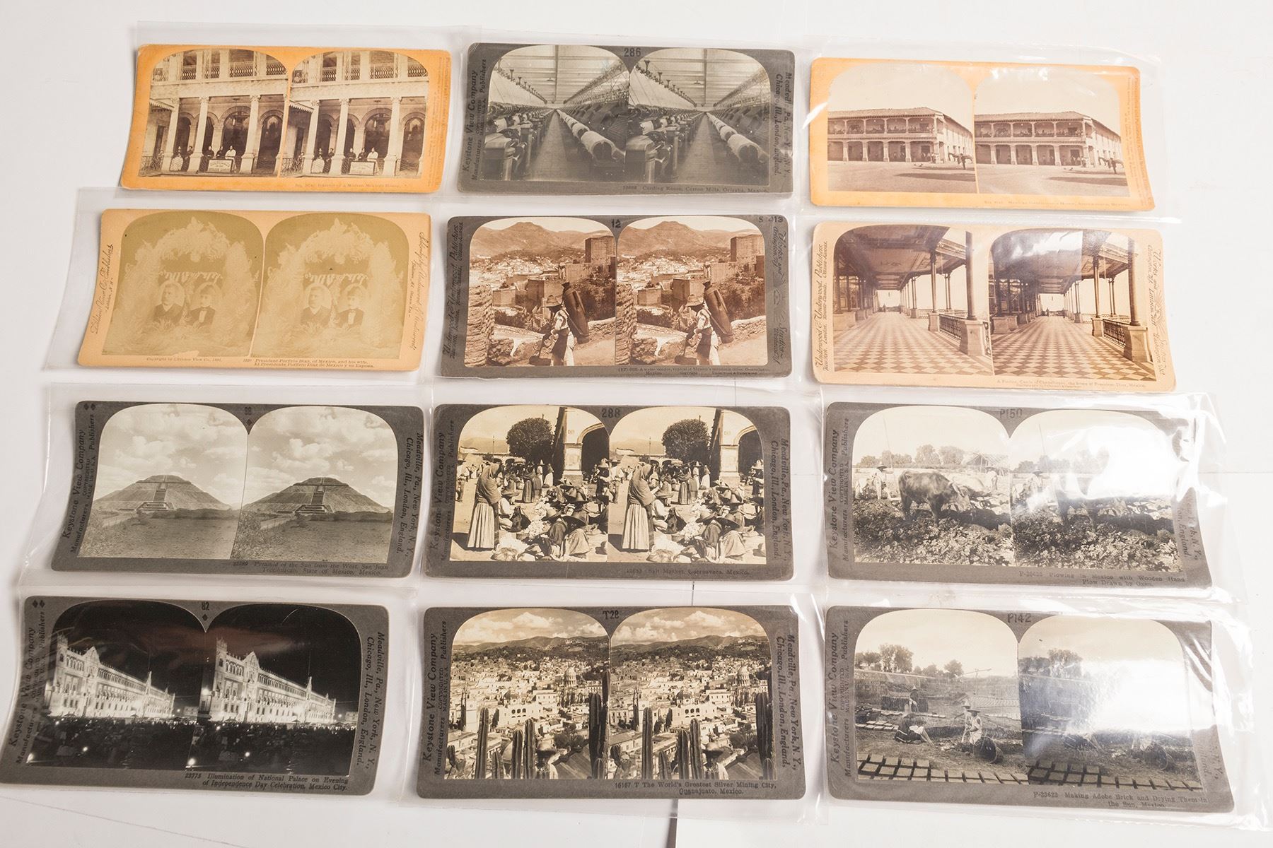 Lot of 12 different stereoviews. 1) Two by Kilburn: 1143--Mexican Gentleman's Home, Ameca-meca and 1074--Interior of a Modern Mexican House. 2) Seven by Keystone: Cotton Mills, Orizaba; Making Adobe Bricks; the World's Greatest Silver Mining City, Guanajuato; National Palace Illuminated, Mexico City; Oxen Plowing; Salt Market, Cuernavaca; and Pyramid of the Sun, Teotihuacan. 3) Two by Underwood: Portico of Castle of Chapultepec and a water-vendor in Guanajuato. 4) Faded view by Littleton View Co. of President Diaz and his wife. (Prag Collection) Date: Location: zMexico HWAC# 54702