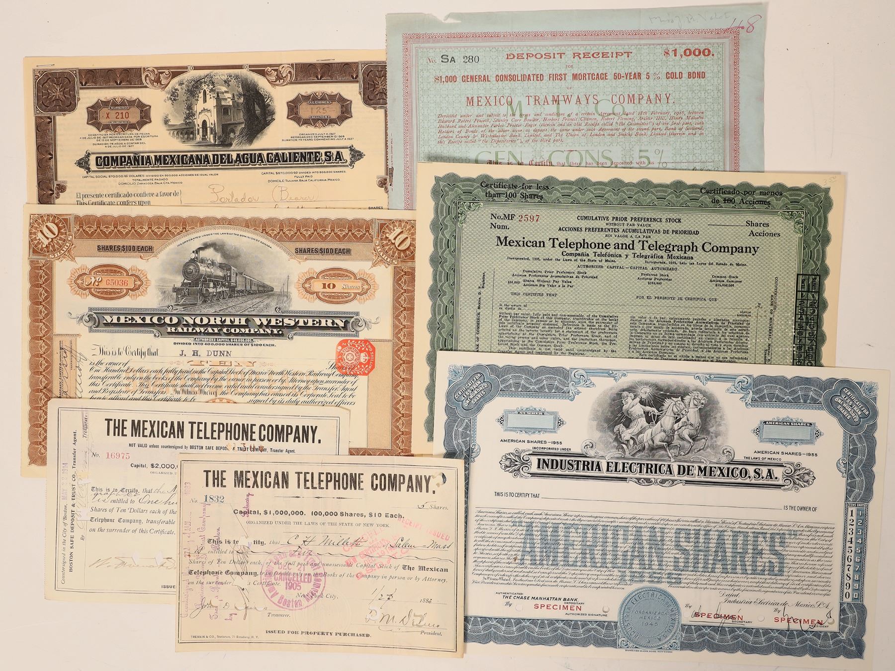 Lot of 7. I/C & I/U. One specimen, one imprinted revenue stamp. Compania Mexicana Delagua Caliente, S.A., Mexico Tramways Co., Mexico North Western RY Co, Mexican Telephone & Telegraph Co, The Mexican Telephone Co (two), Industria Electra De Mexico, S.A.. Printers : Hamilton BNC, Tremain & Co, American BNC, Jefferies BNC.[ Mexico Ken Prag Collection