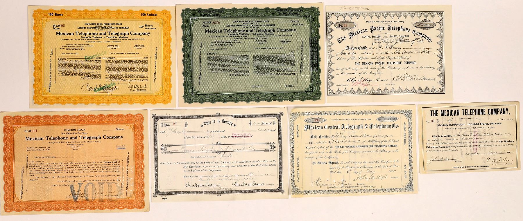 Lot of 7. Includes: The Mexican Telephone Company (1882); Mexican Central Telegraph & Telephone Co. (1885); Mexican Pacific Telephone Co. (1883); and the Mexican Telephone & Telegraph Co. (1905, plus 3 unissued).