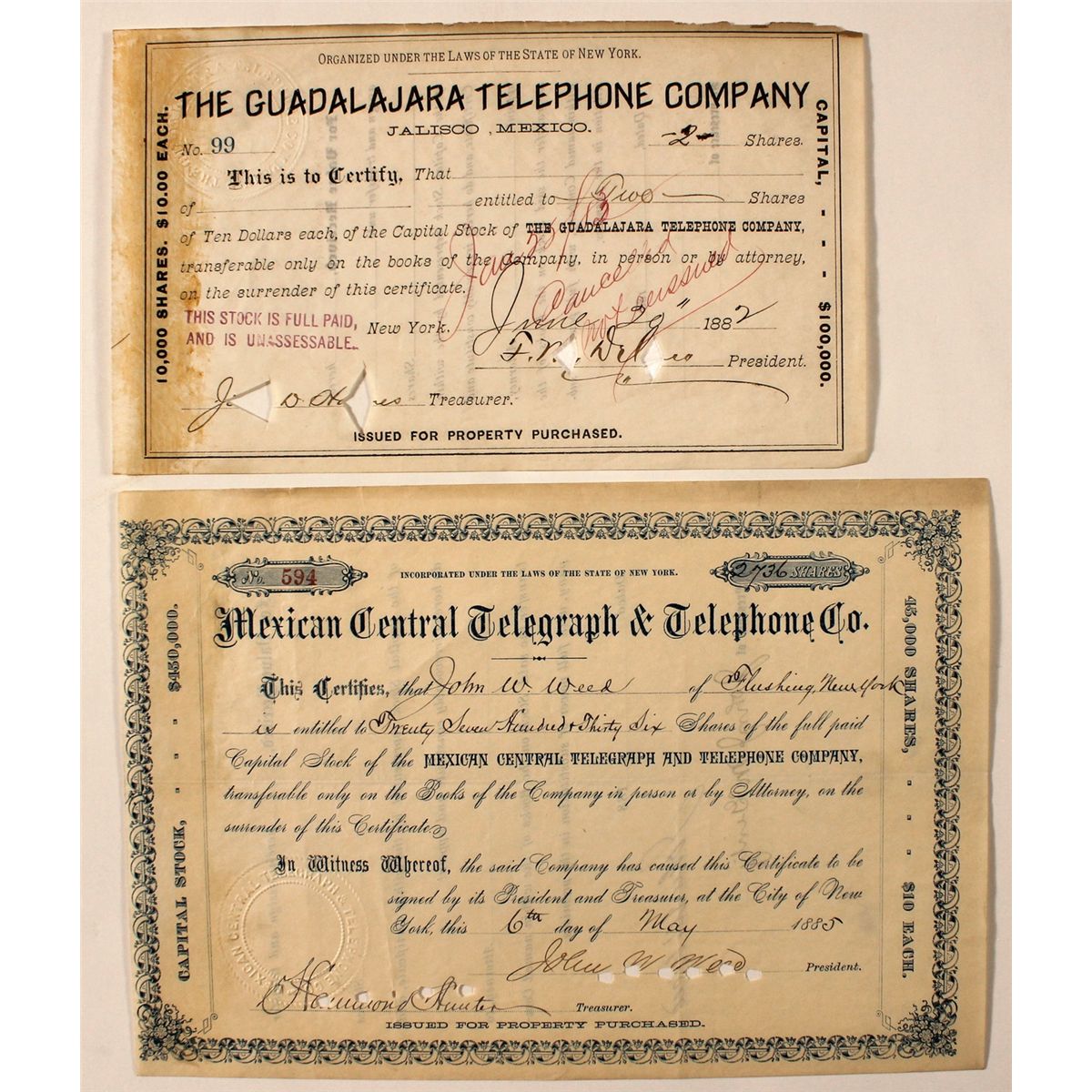 Group of two, both organized under the laws of New York. 1) The Guadalajara Telephone Company, No. 99, 2 shares issued on June 20, 1882. Datelined Jalisco, cancelled by red pen and hole punch. 2) Mexican Central Telegraph and Telephone Co., No. 594, issued for 2736 shares to John W. Weed on May 6, 1885. Cancelled by hole punch. Date , zMx hwac 20902