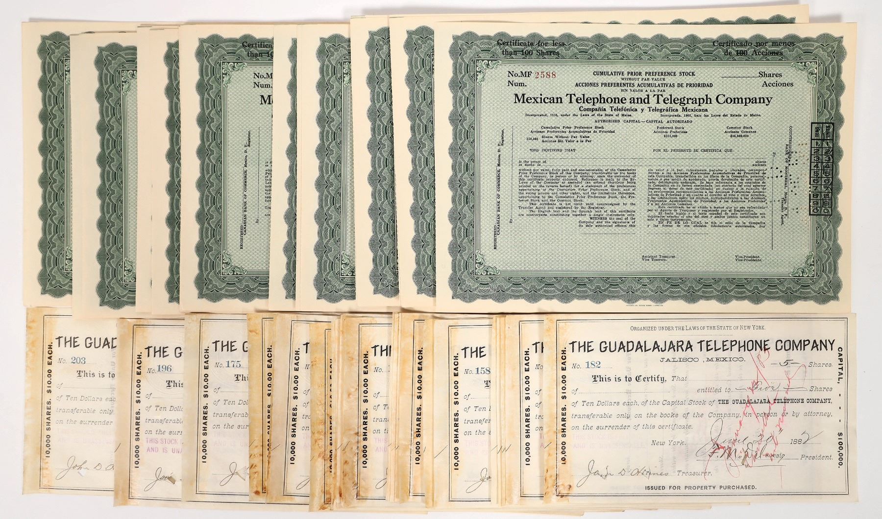 About 20 each. Issued 1882 Guadalajara Telephone and unissued Mexican Telephone and Telegraph.