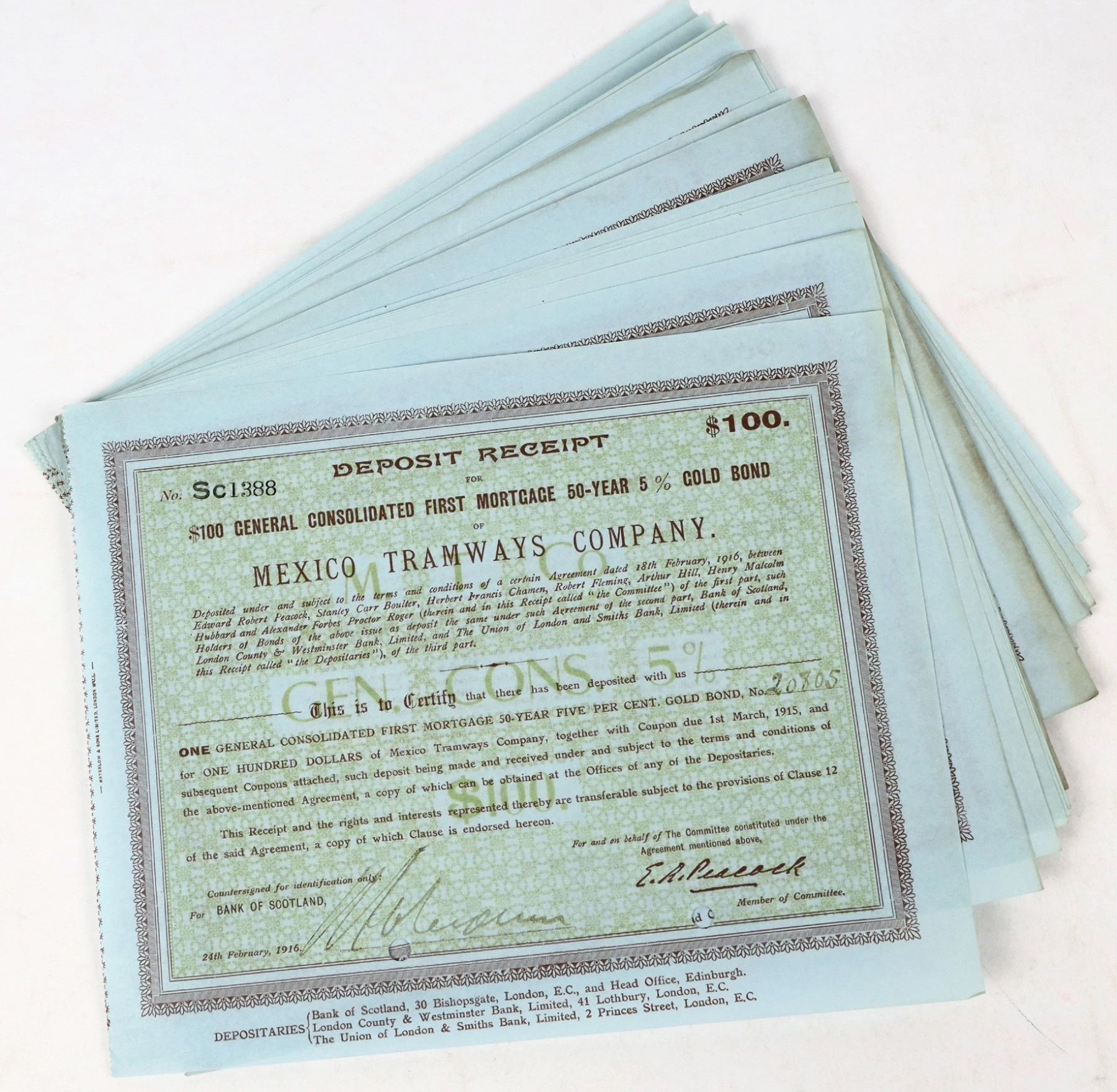 Large group (approx. 25) unissued $100 certificates. Titled as "$100 General Consolidated First Mortgage 50-Year 5% Gold Bond of MEXICO TRAMWAYS COMPANY." Drawn on the Bank of Scotland, signed and dated February 1916. Punched at base, notes are in excellent condition. Please see photos.