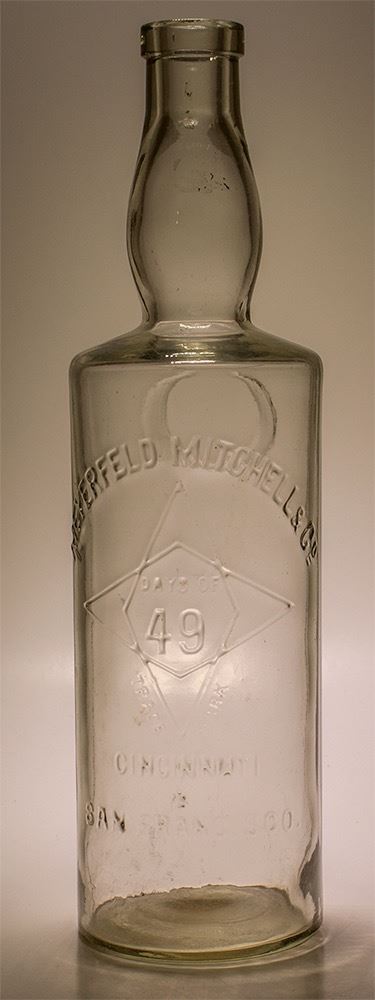 Meyerfeld Mitchell & Co., Days of 49 whiskey, San Francisco. Days of 49 inside four point star. Clear, Bulbous neck, 11" tall, Barnett 552. The Days of 49 whiskey is a very popular whiskey especially with California Gold Rush collectors. This rare bottle is sparkling mint. We offered a similar example last year with a small crack that sold well. A must for California gold collectors. City: San Francisco State: California, Date: Inventory# 40962